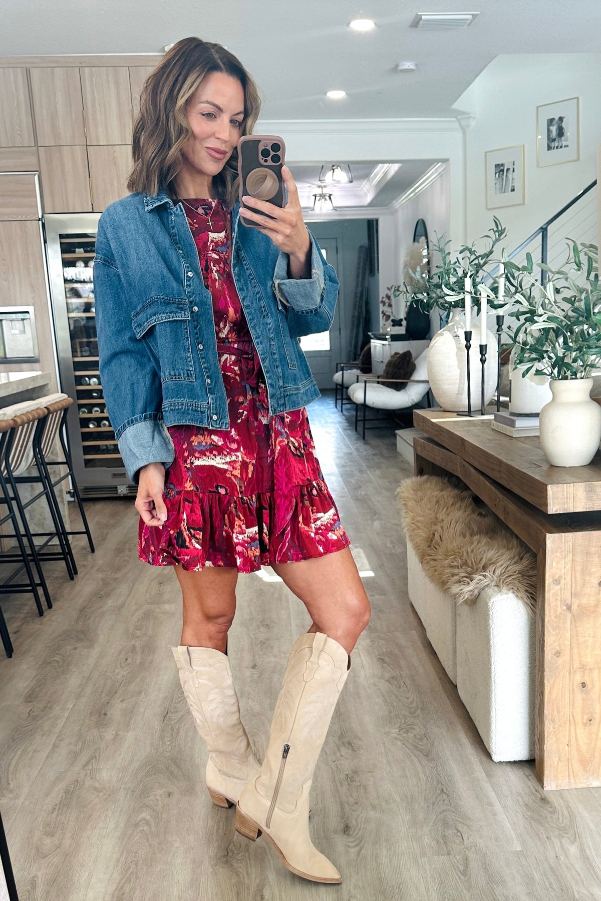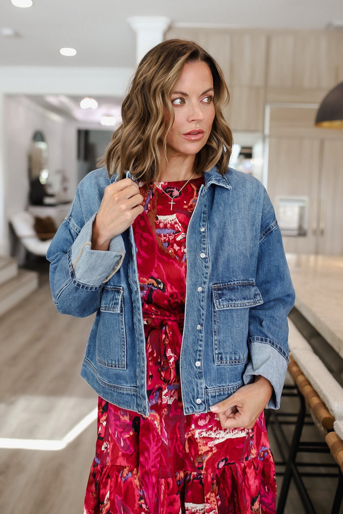 RISEN Oversized Cargo Pocket Denim Jacket with Cuffed Sleeves