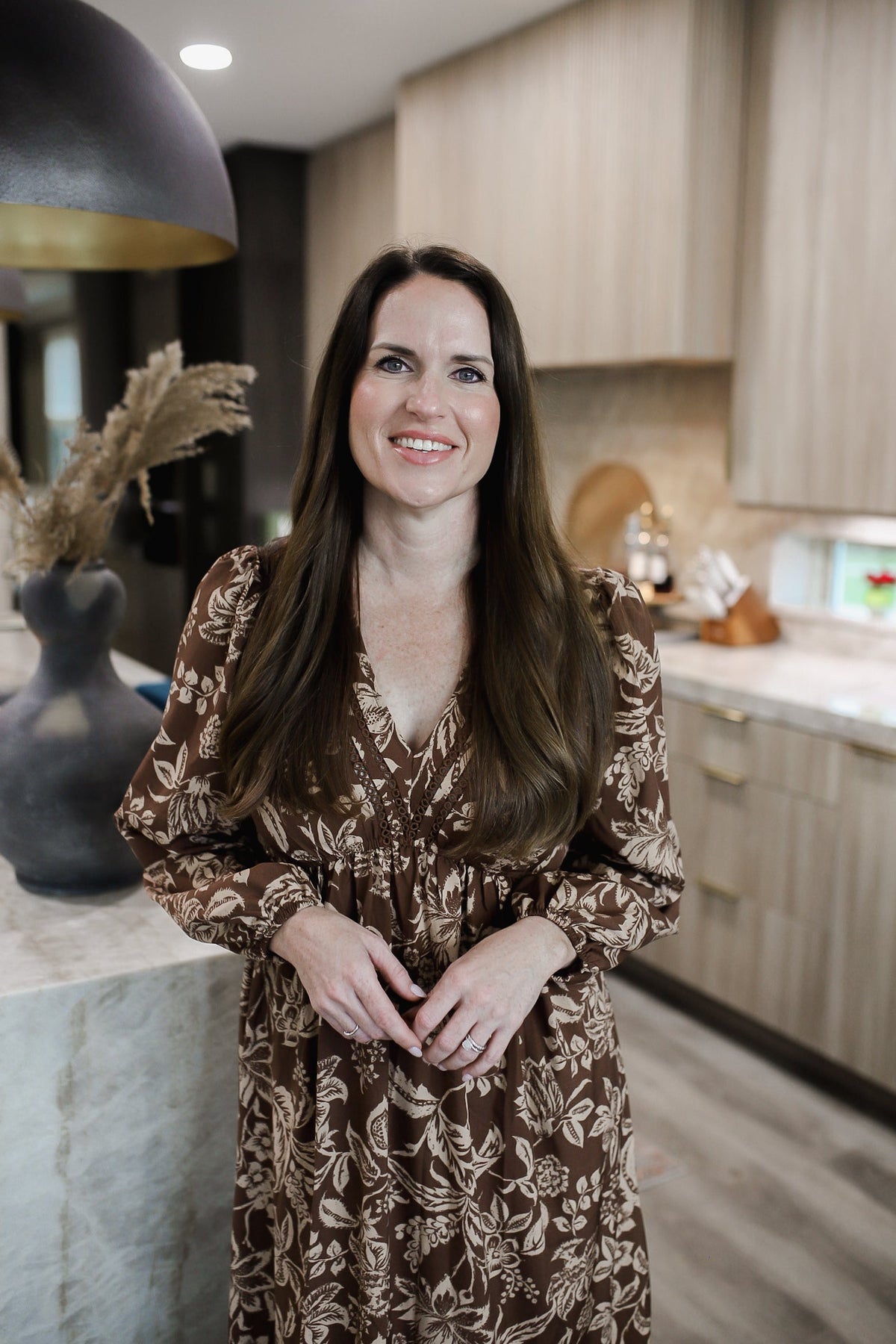 Ruched Printed V-Neck Long Sleeve Midi Dress