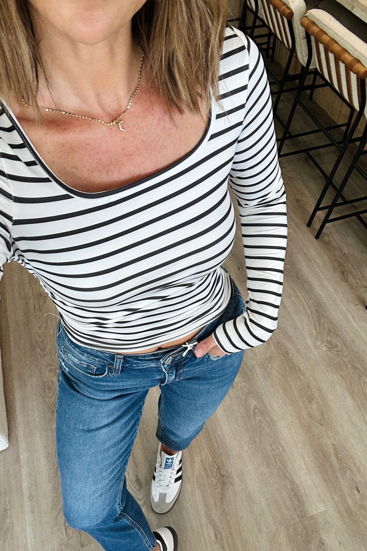 This stylish striped square neck long sleeve t-shirt features a classic black and white horizontal stripe pattern that never goes out of style. The elegant square neckline adds a feminine touch while the fitted silhouette flatters the figure. Made from comfortable stretch cotton blend material that moves with you throughout the day. Perfect for casual outings, layering, or everyday wear. The long sleeves provide coverage while the timeless striped design ensures versatility in your wardrobe. Pairs effortlessly with jeans, skirts, or shorts for a chic casual look. The model is in the small.