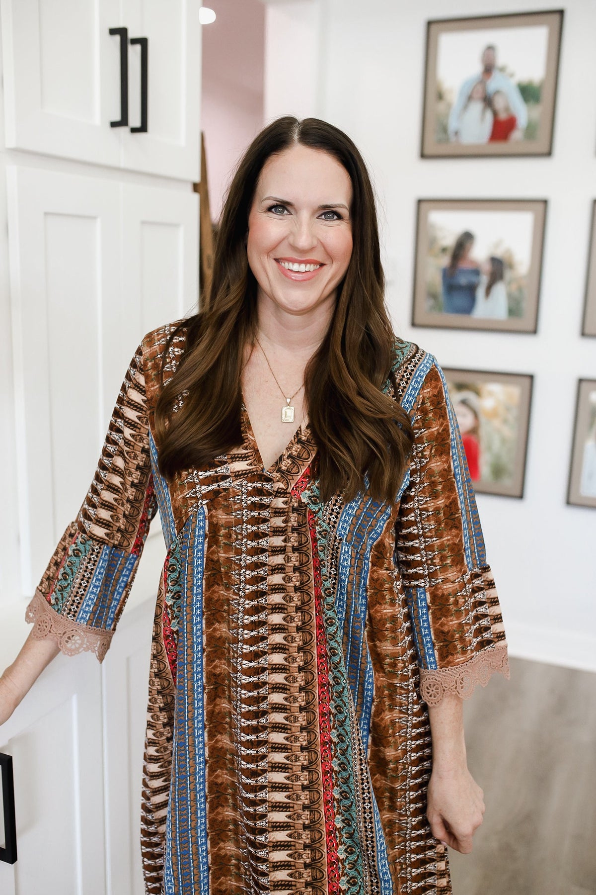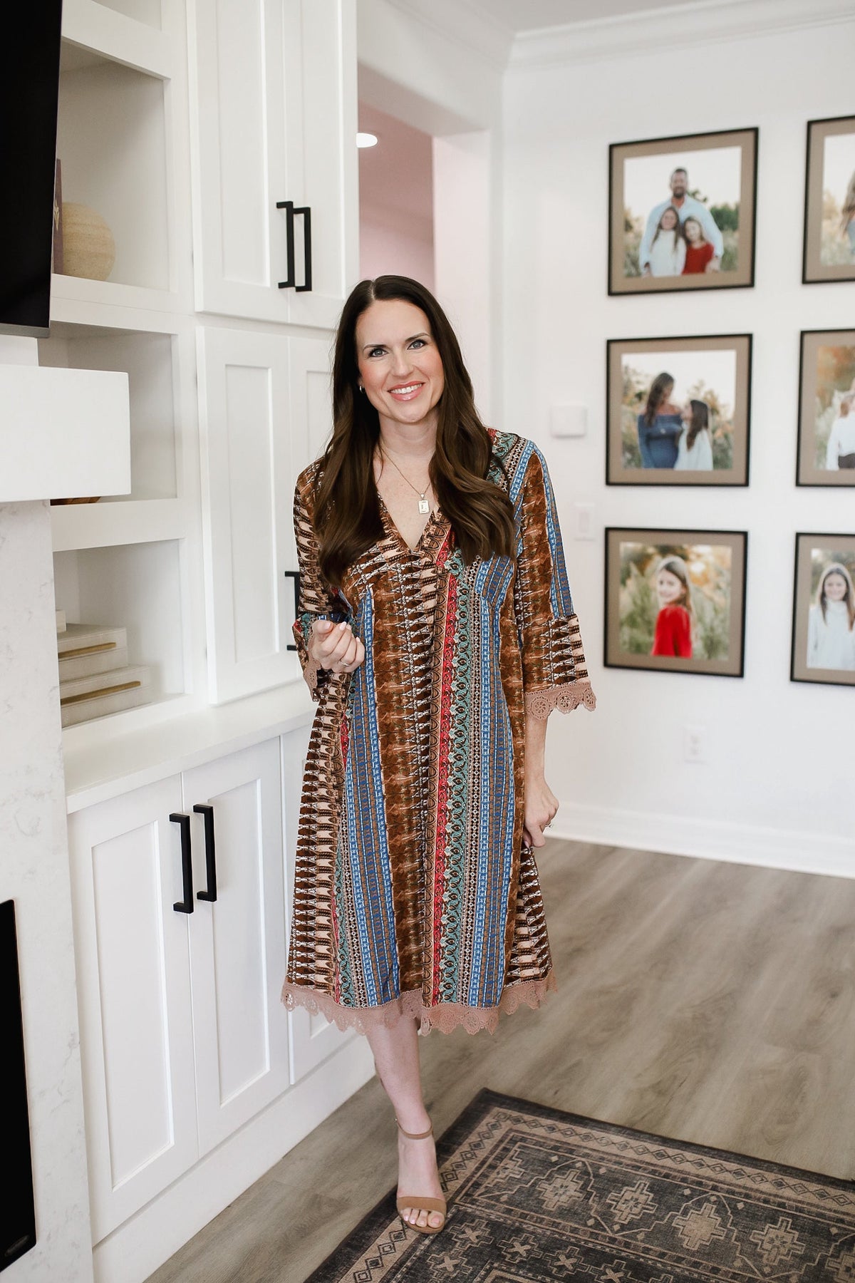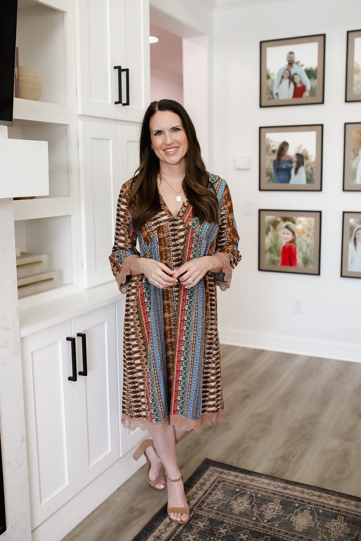 Lace Trim Printed V-Neck 3/4 Sleeve Dress WH