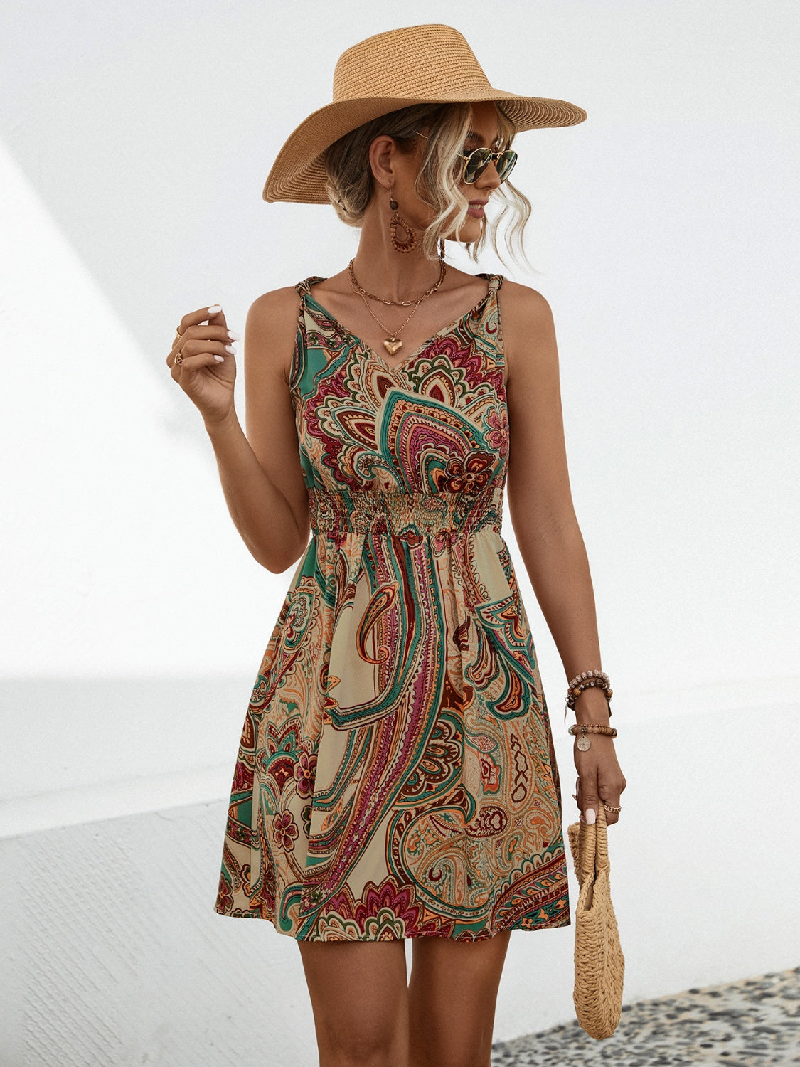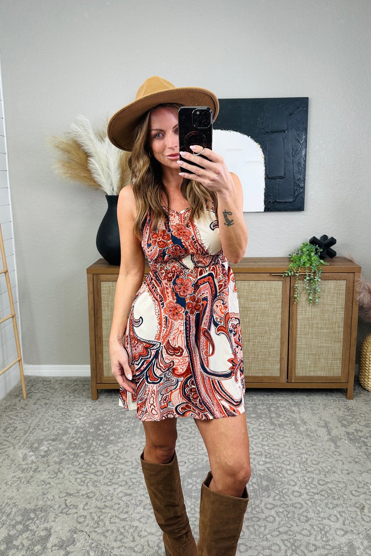 Get ready to turn heads in our Smocked Printed V-Neck Mini Dress. This playful dress features a flattering smocked design and a fun printed pattern for a quirky and unique look. Perfect for any occasion, this dress will have you feeling confident and stylish. The model is in the small.