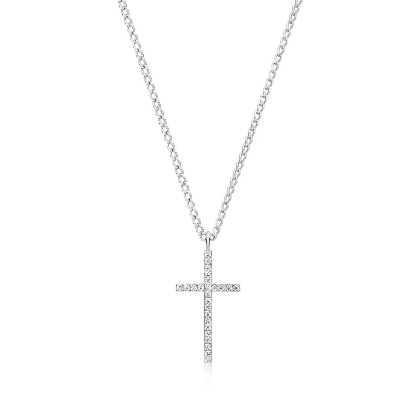 • The Vertical Cross Pendant measures 1” in height, featuring 25 sparkling Cubic Zirconia stones, each 1.4mm, drawing every eye with their brilliance.