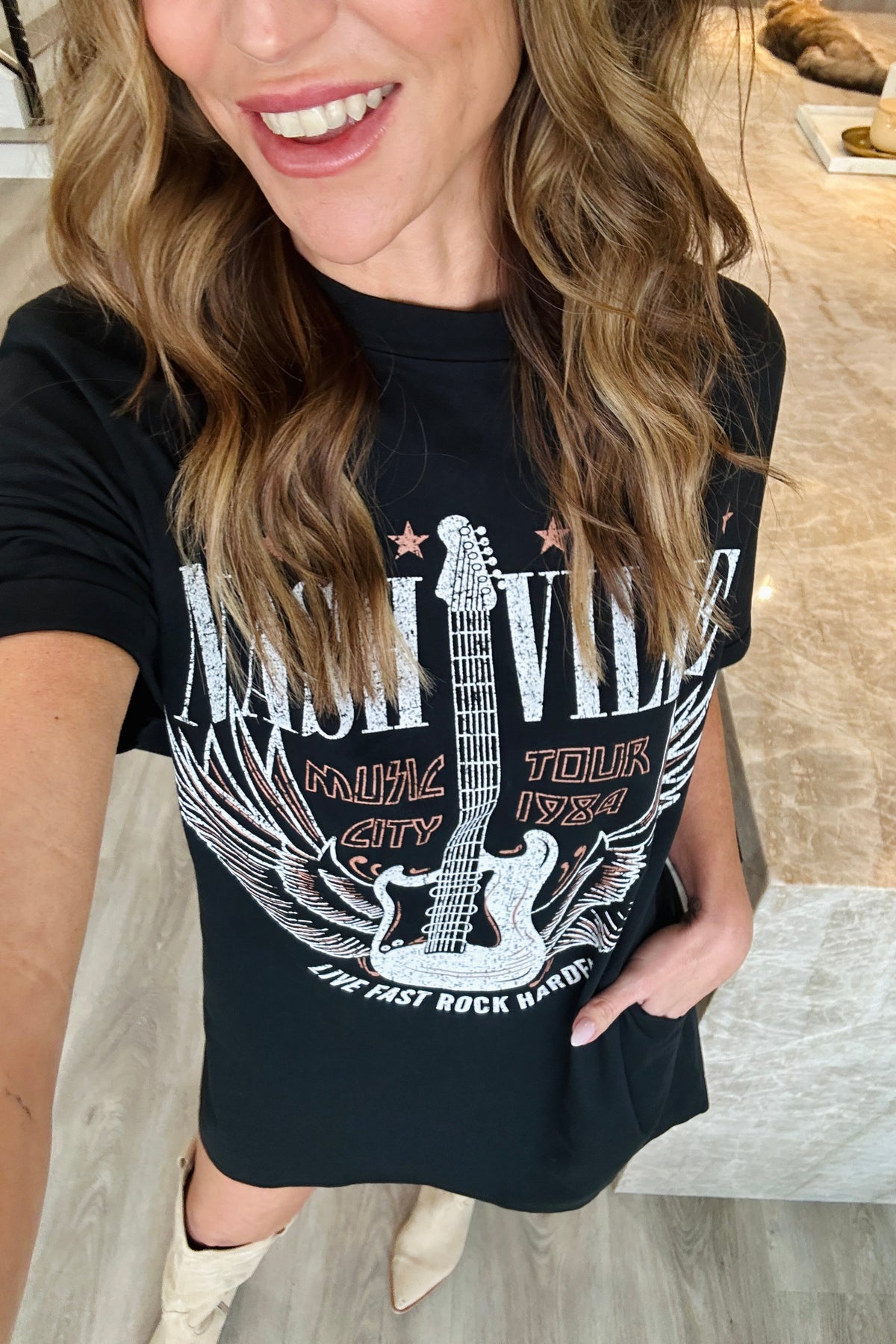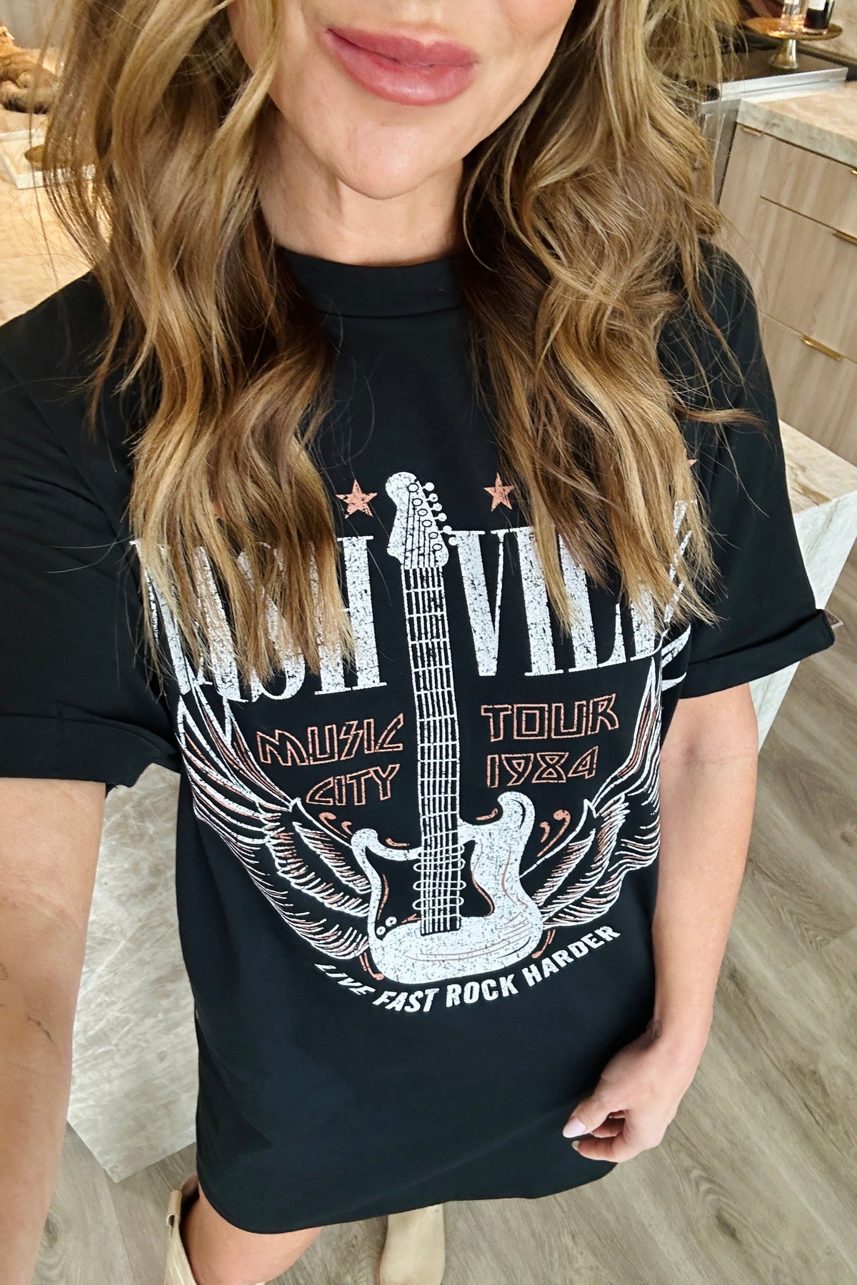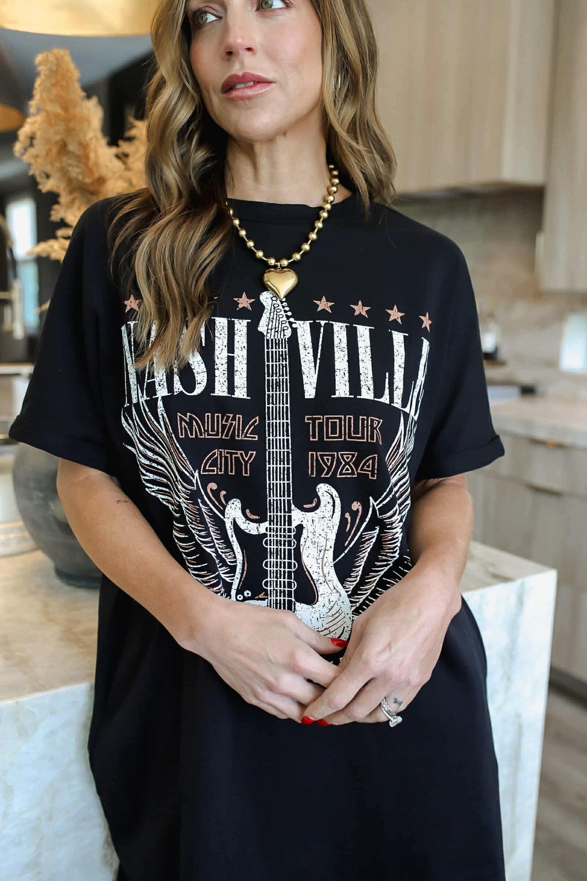 Rock your look with effortless style in our Short Sleeve Graphic T-Shirt Dress—a must-have for trendy women who love a mix of comfort and cool. Featuring a Music City guitar print, this dress is made for year-round wear, perfect for casual outings, concerts, or wherever your day takes you.