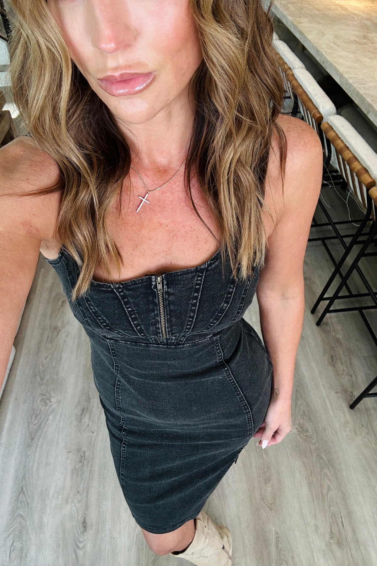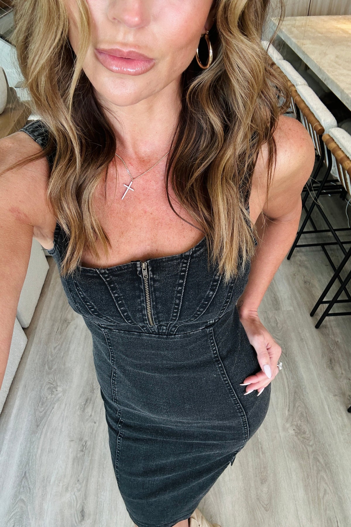Easy, edgy, and effortlessly cool—this Side Slit Washed Denim Dress is serving major off-duty style. With a flattering scoop neckline, bold zipper detail, and a flirty side slit, this dress is made to turn heads while keeping things casual and comfy.