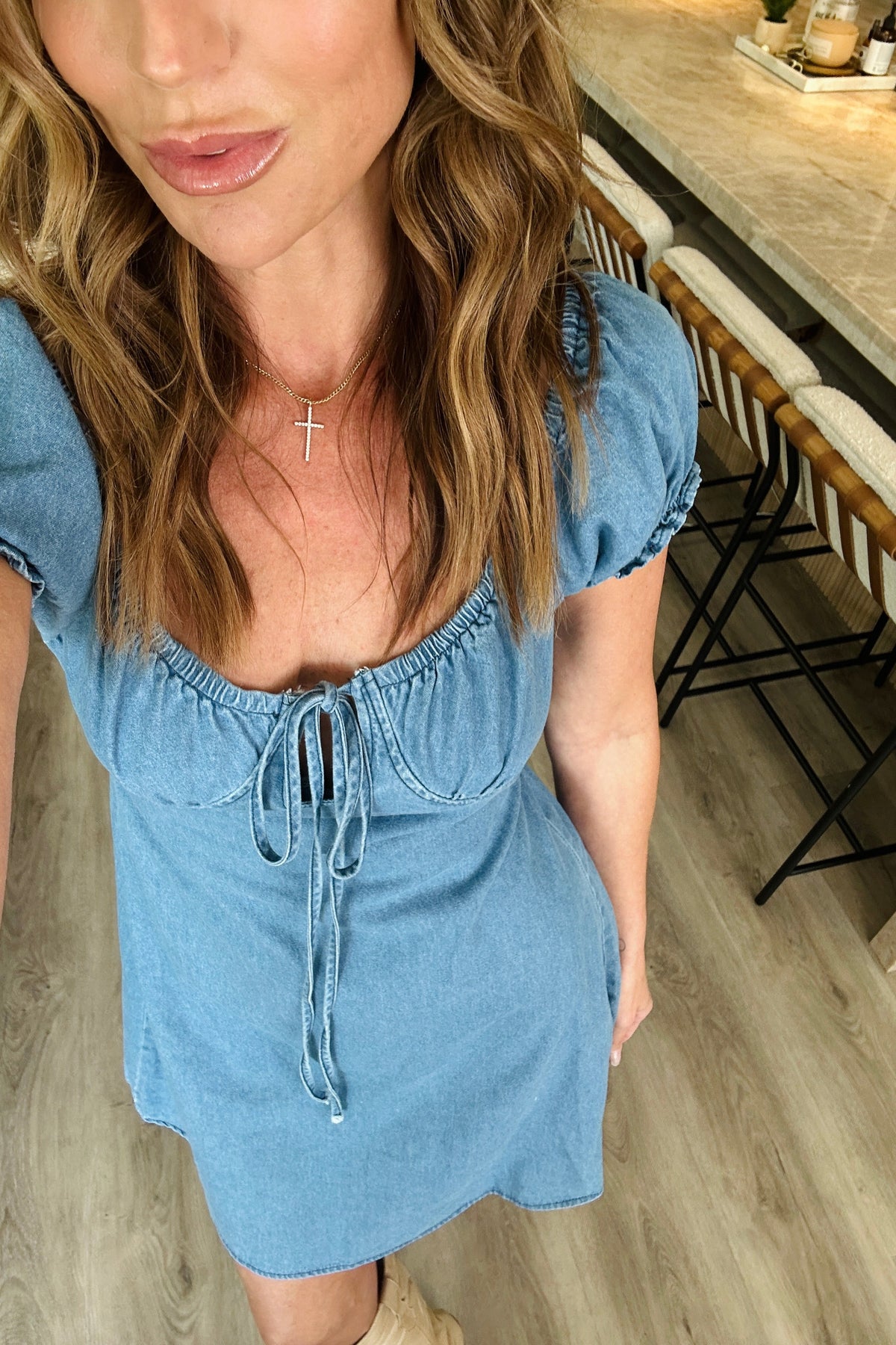 Flirty, fun, and effortlessly stylish—this denim dress is made for everything from brunch dates to concert nights with your besties. Featuring a slight puff sleeve for a touch of femininity, a chic tie neckline, and an elastic waist for extra comfort and the perfect fit, this dress is equal parts cute and comfy.