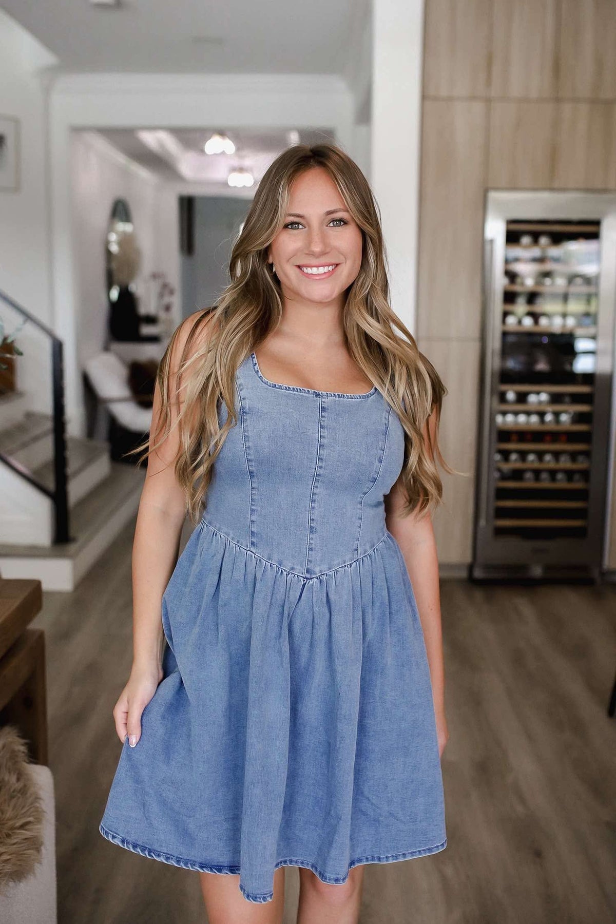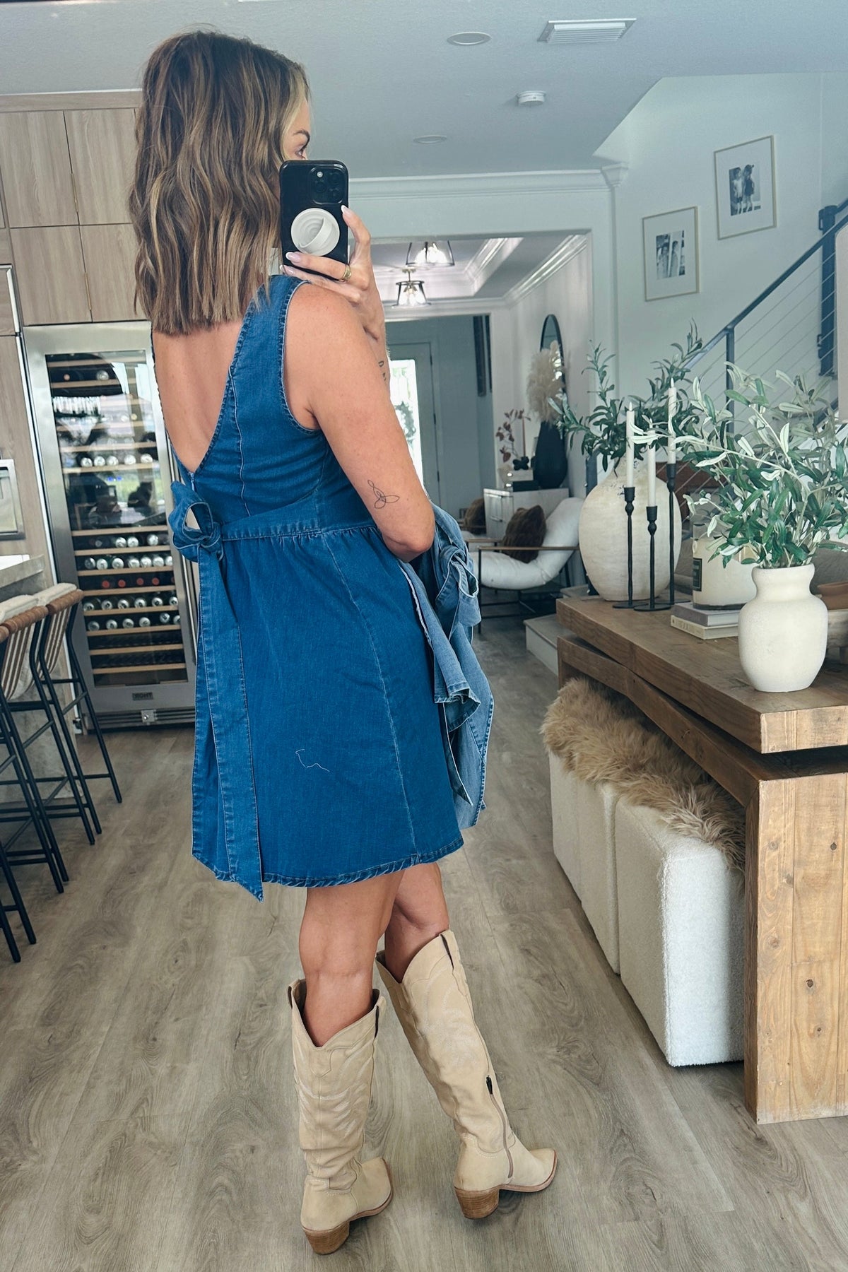 Sweet with a little sass, the V-Back Bow Tie Denim Skater Dress is your flirty go-to for sunny days, weekend plans, and everything in between. Made from soft, lightweight denim, this skater silhouette cinches at the waist and flares out for a flattering, twirl-worthy finish.