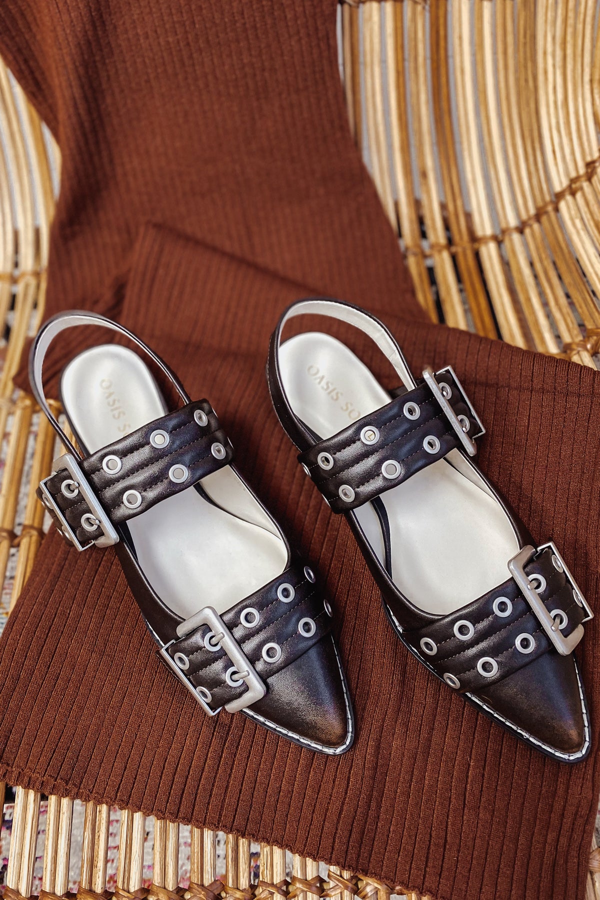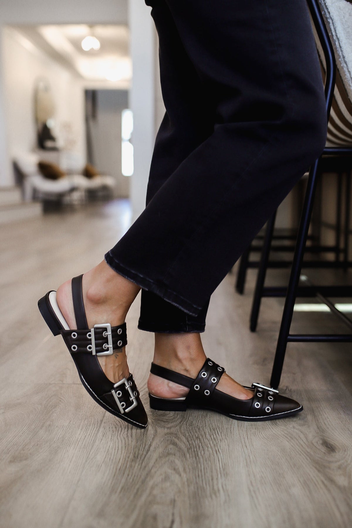 A modern twist on a classic, this double buckle ballet flat features a pointed toe for added edge. Crafted with atelier-picked materials, The Harlow effortlessly combines sleek design with standout style.