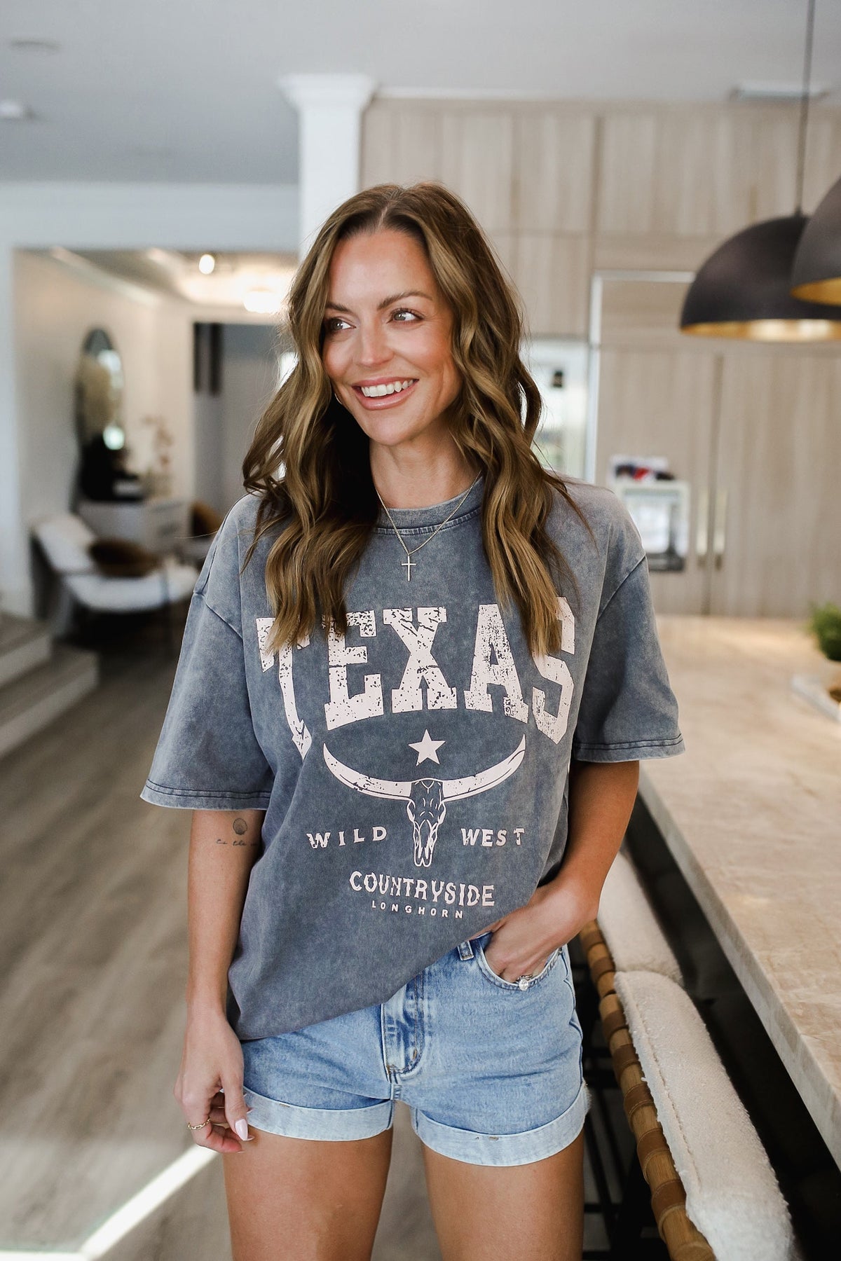 Country cool meets laid-back vibes in this TEXAS Steer Head Graphic Tee—your new go-to for everything from country concerts to weekend hangs. Featuring a bold pink steer head graphic on a mineral-washed black oversized tee, this top is all about that effortlessly edgy, Southern-inspired style.