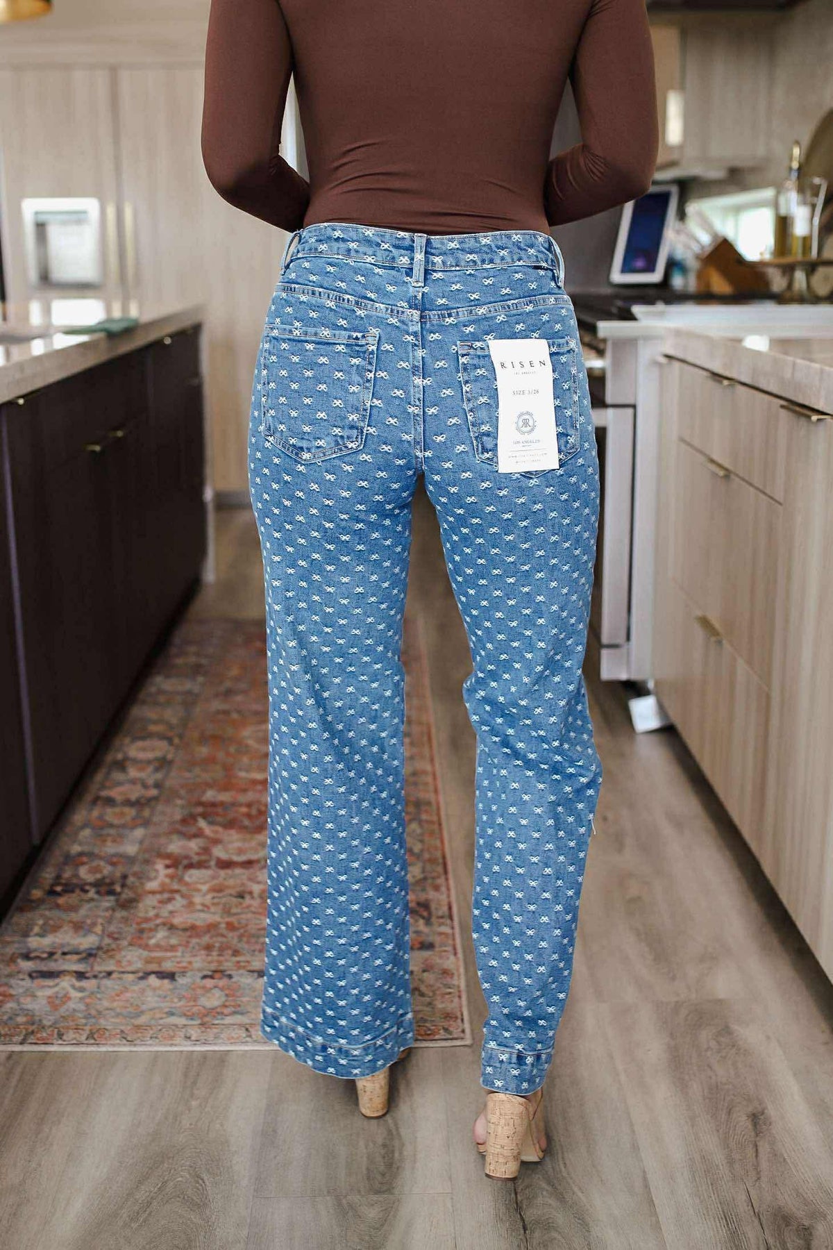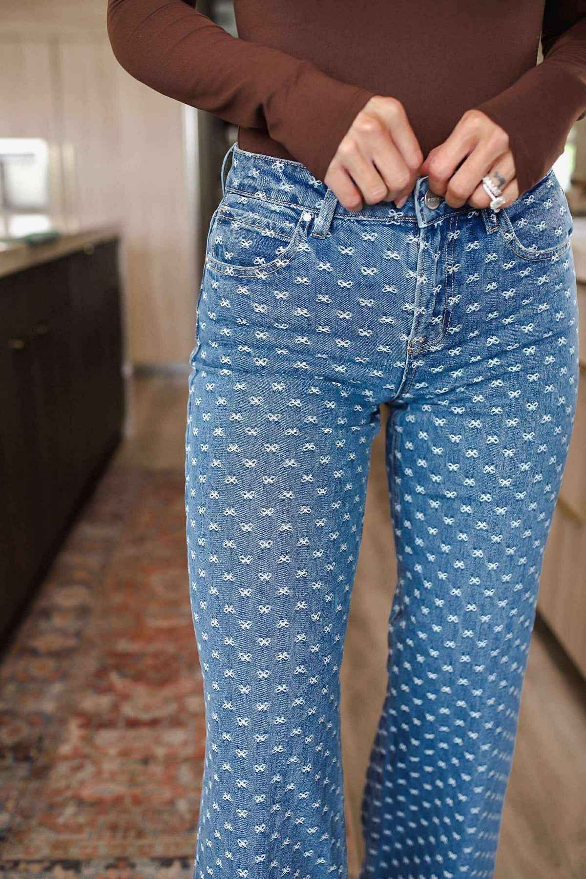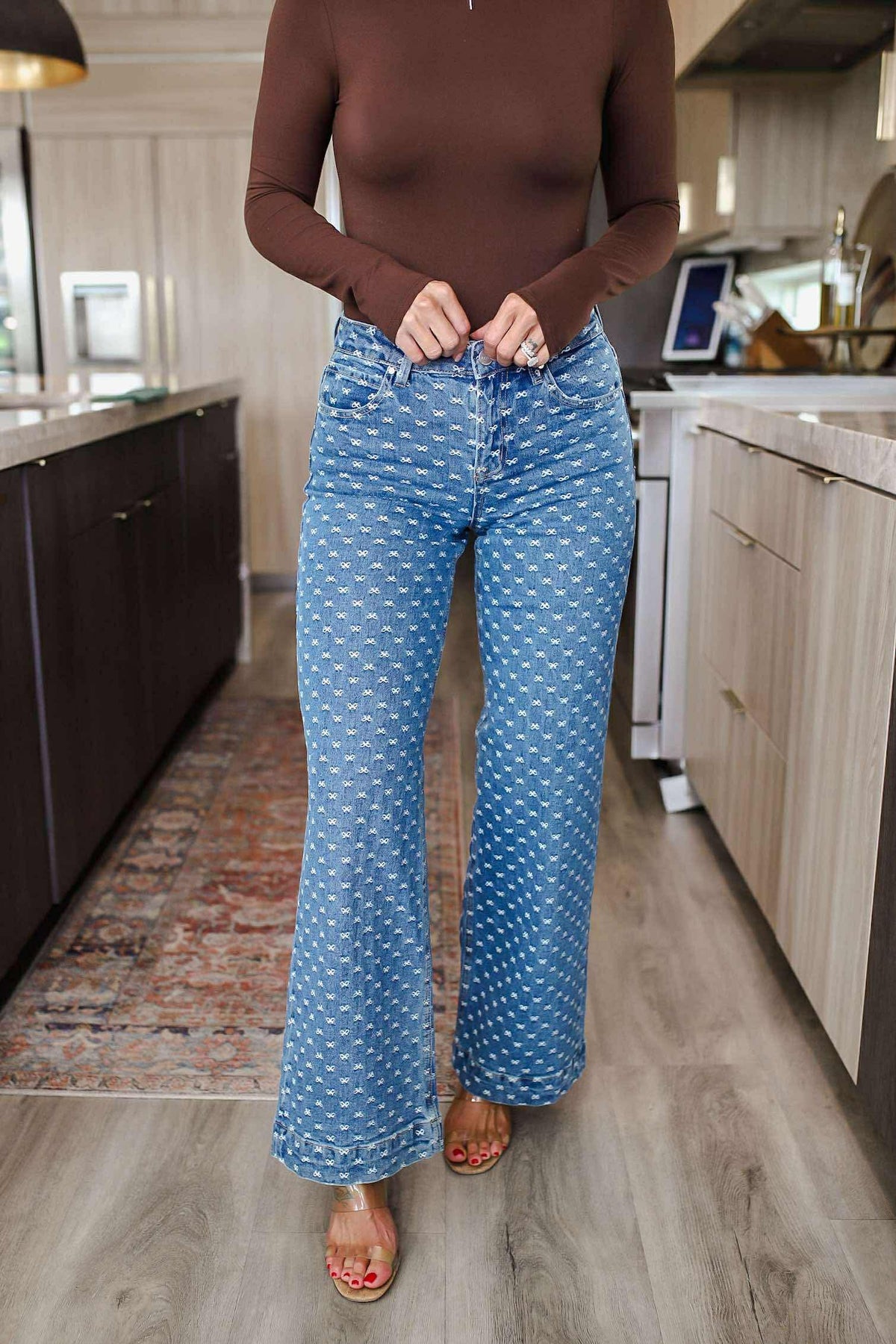 The High Rise Wide Leg Bow Embroidered Jeans are a charming and unique addition to your denim collection. With a high rise waist and wide leg silhouette, these jeans offer a flattering and on-trend fit. The bow embroidery detailing adds a touch of whimsy and feminine flair, making them stand out from the crowd. Pair these jeans with a tucked-in blouse and heels for a stylish and sophisticated ensemble. Embrace a playful and fashion-forward look with these adorable bow embroidered jeans.