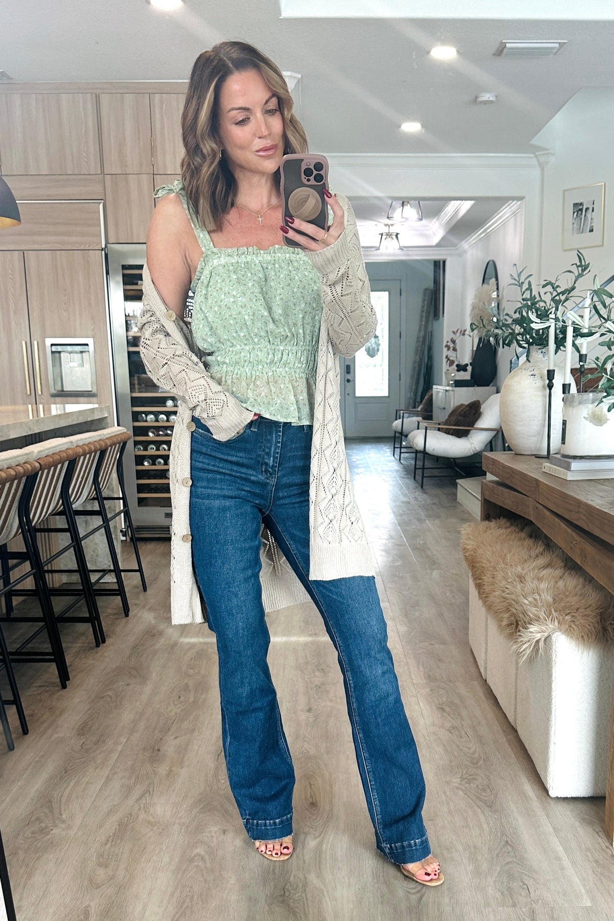 Elevate your denim game with the perfect mix of classic structure and modern edge. Crafted from comfort stretch denim, these high-rise bootcut jeans feature a sleek trouser-style hem for a polished finish that pairs effortlessly with boots or heels. The full-length silhouette elongates the leg, while the bootcut shape balances every figure for a flattering fit. The model is a 4, wearing the 3. You can size down one from your even size. Paired with Call Me Cute top.
