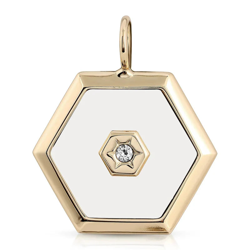 Ashley Pendant is recycled brass plated 14K gold Center of the pendant is filled with white or black enamelHexagon shaped pendant measures 1.25" long x 1.58" widePendant's center stone is Swarovski CrystalHandmade in the USA