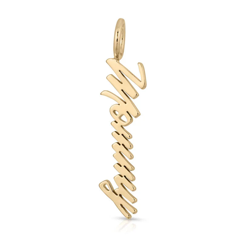 Script Mommy Pendant is recycled brass plated 14K Gold