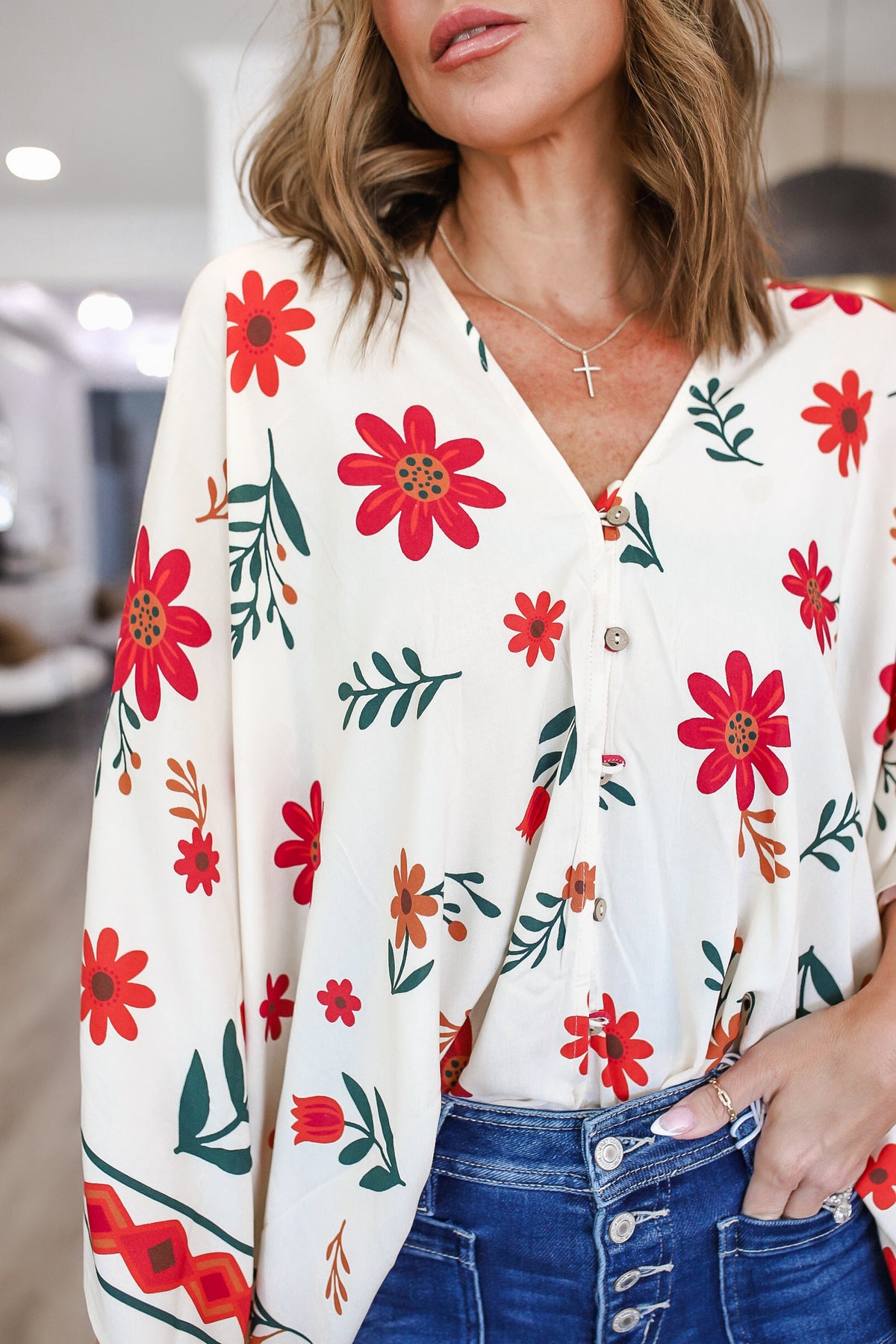 Flowy, free-spirited, and full of charm. The On the Verge Border Print Top features a soft floral border print with a lightweight, airy feel that’s perfect for all-day wear. Designed with a relaxed poncho-style silhouette, wide sleeves, and a button-down front, this boho beauty drapes effortlessly for an easy, flattering fit. Dress it up with denim or keep it casual with shorts for that laid-back, wanderlust vibe. The model is in the small. Paired with Timeless Jeans.