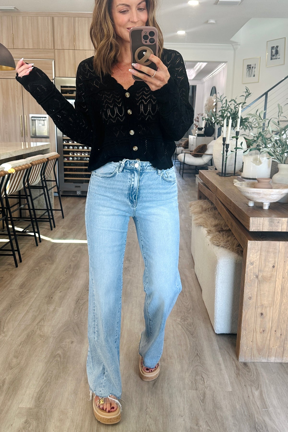 Elevate your everyday wardrobe with this sophisticated long sleeve cardigan, designed for effortless versatility. Crafted from a lightweight knit fabric, it drapes beautifully while maintaining its shape throughout the day. The button-down V-neck creates a flattering neckline, while the open knit pattern detail adds visual interest and subtle texture. Cut to a true-to-size fit, this piece transitions seamlessly from layering over basics to standing alone as a statement layer. The timeless black colorway pairs with virtually any outfit, making it an essential addition to any closet. The model is in the small. Paired with Wistful thinking jeans.