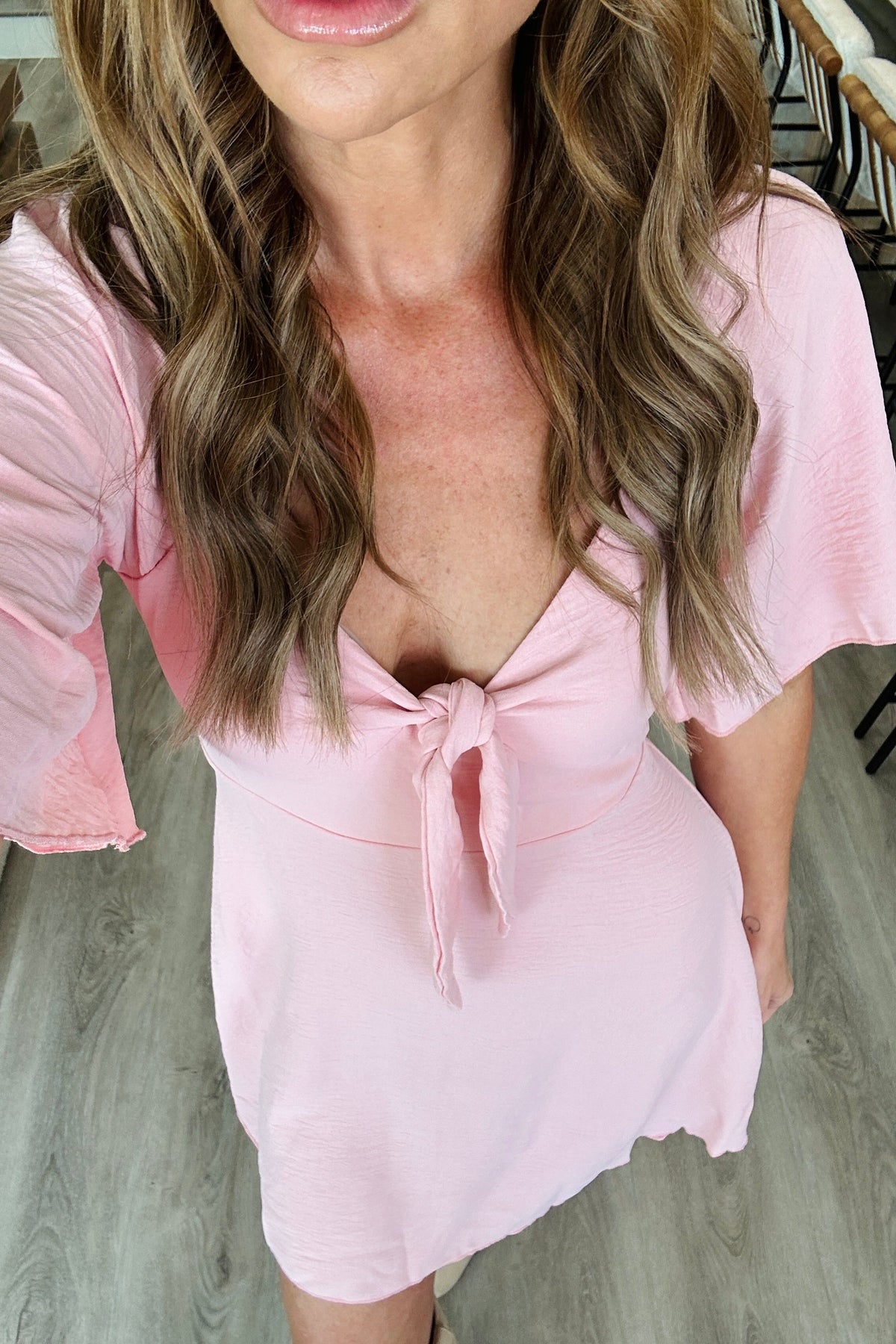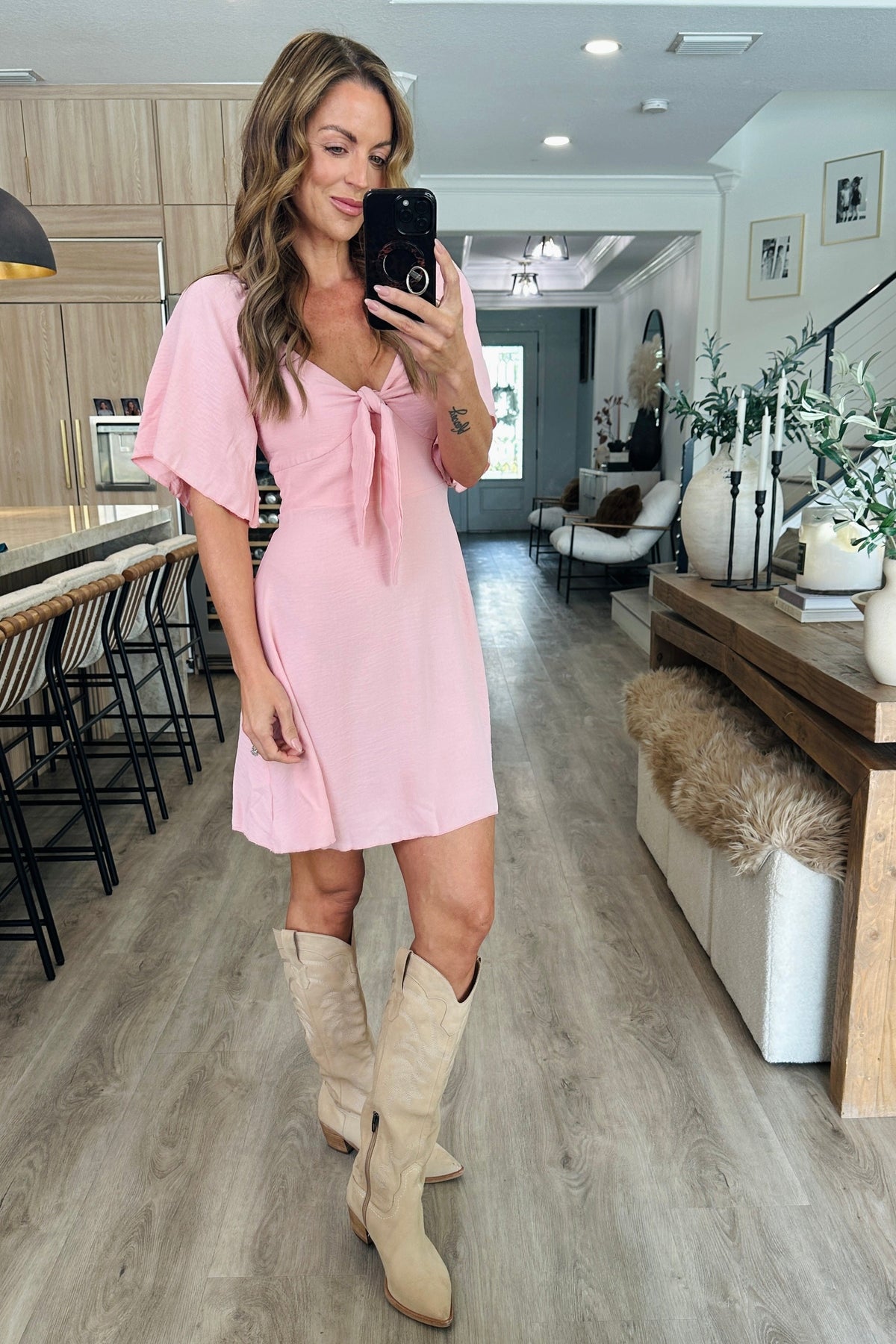 Sweet, stylish, and effortlessly flattering—our Smocked Back Knotted Flutter Sleeve Dress is a warm-weather must-have. Featuring a charming front knot detail and soft flutter sleeves, this dress brings a playful yet polished vibe. The smocked back offers a comfortable, flexible fit that hugs you in all the right places, while the breezy silhouette keeps you cool and confident. Perfect for everything from garden parties to weekend getaways—just add sandals or wedges and you’re set! The model is in the small.