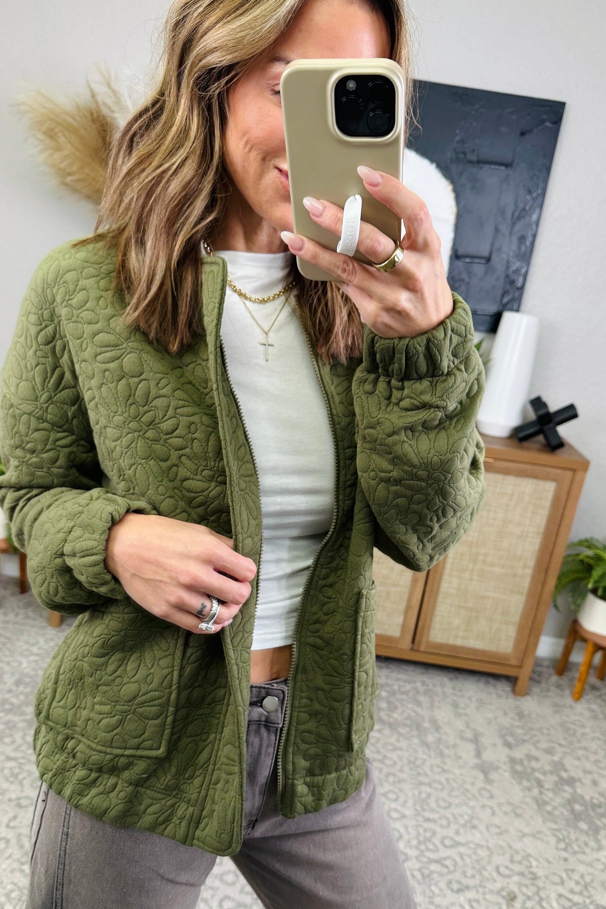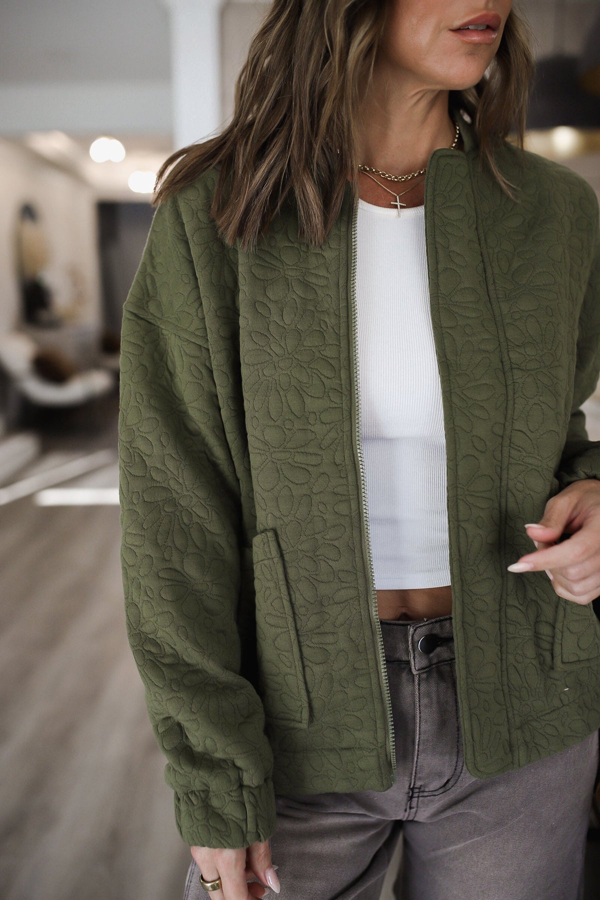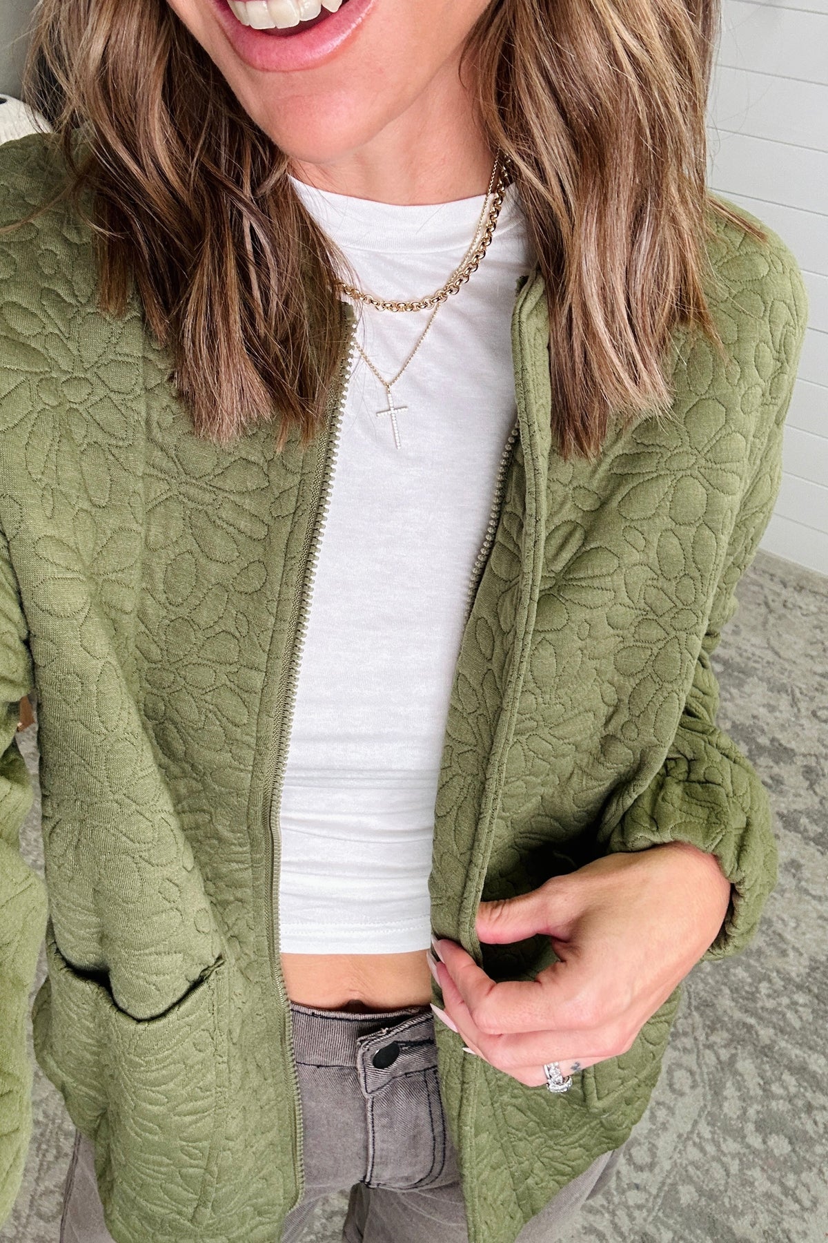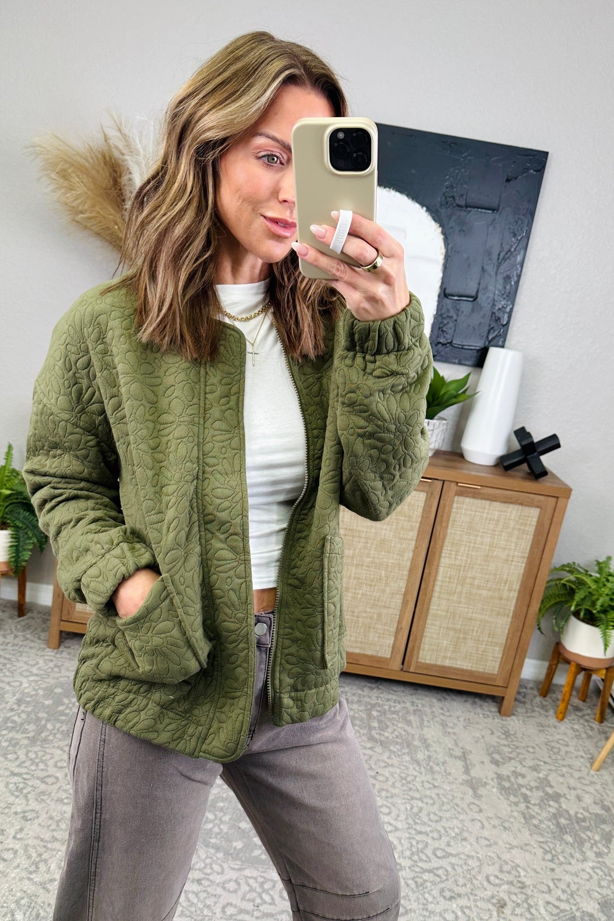 Stay stylish and warm with our Baseball Collar Floral Quilted Jacket. This unique jacket features a floral quilted design that adds a pop of design to any outfit. Perfect for those chilly days, this jacket is sure to be a statement piece in your wardrobe. Play ball with fashion and stay cozy with this jacket. The model is in the small.