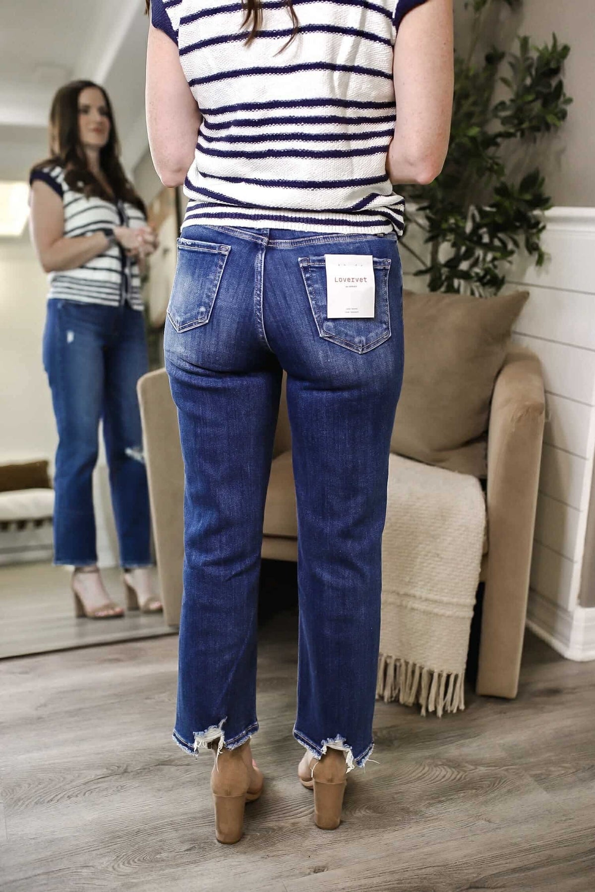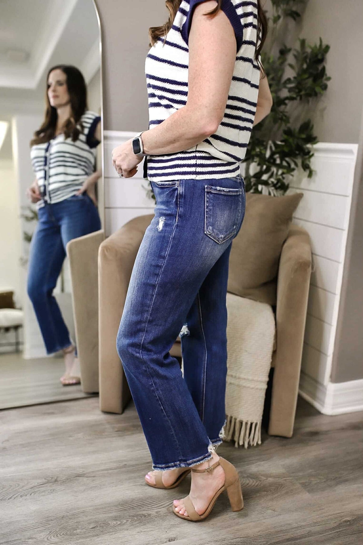 For the busy mom who wants to stay stylish without sacrificing comfort, these trendy straight-leg jeans are the perfect addition to your spring and summer wardrobe. Designed with open-knee distressing and an ankle-length cut, they bring just the right amount of edge to your everyday looks.