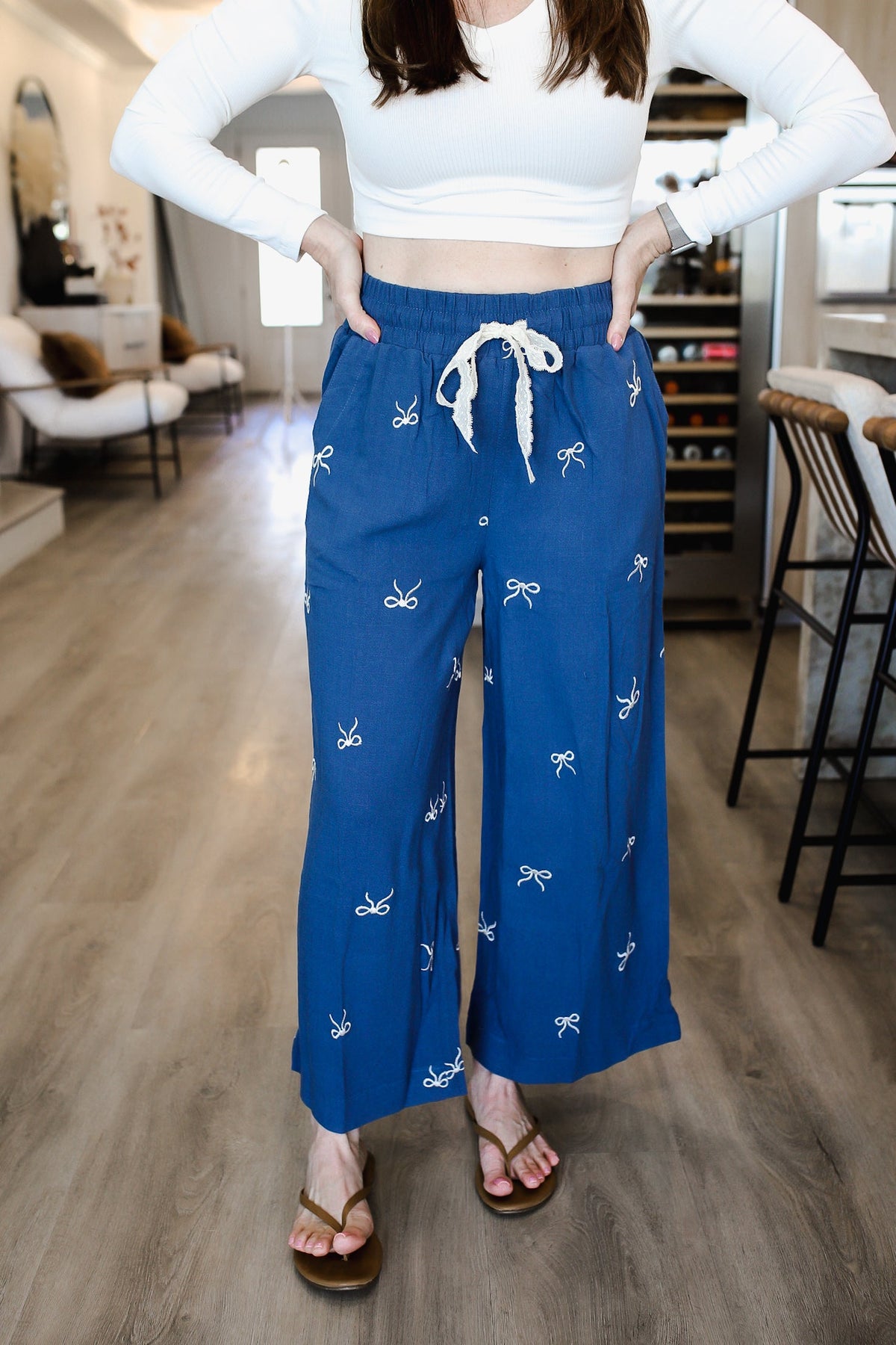These wide-leg pants feature a combination of lace drawstring closure, and embroidered bows, combining elegance and femininity in their design. The lace accents add a touch of delicate sophistication, while the embroidered bows provide a charming and whimsical element. The drawstring waist offers adjustability and comfort, allowing for a customized fit. With their wide-leg silhouette, these pants create a flowy and chic look that is perfect for both casual and dressy occasions.