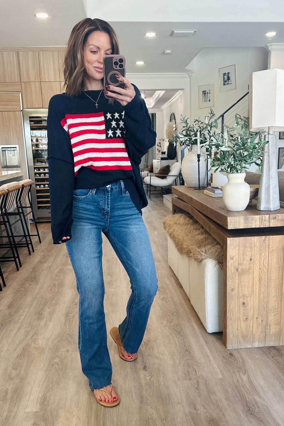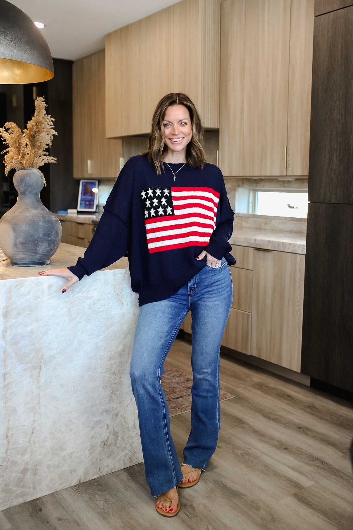 Model is in the 3. Paired with Patriotic Long Sleeve Print Knit Pullover