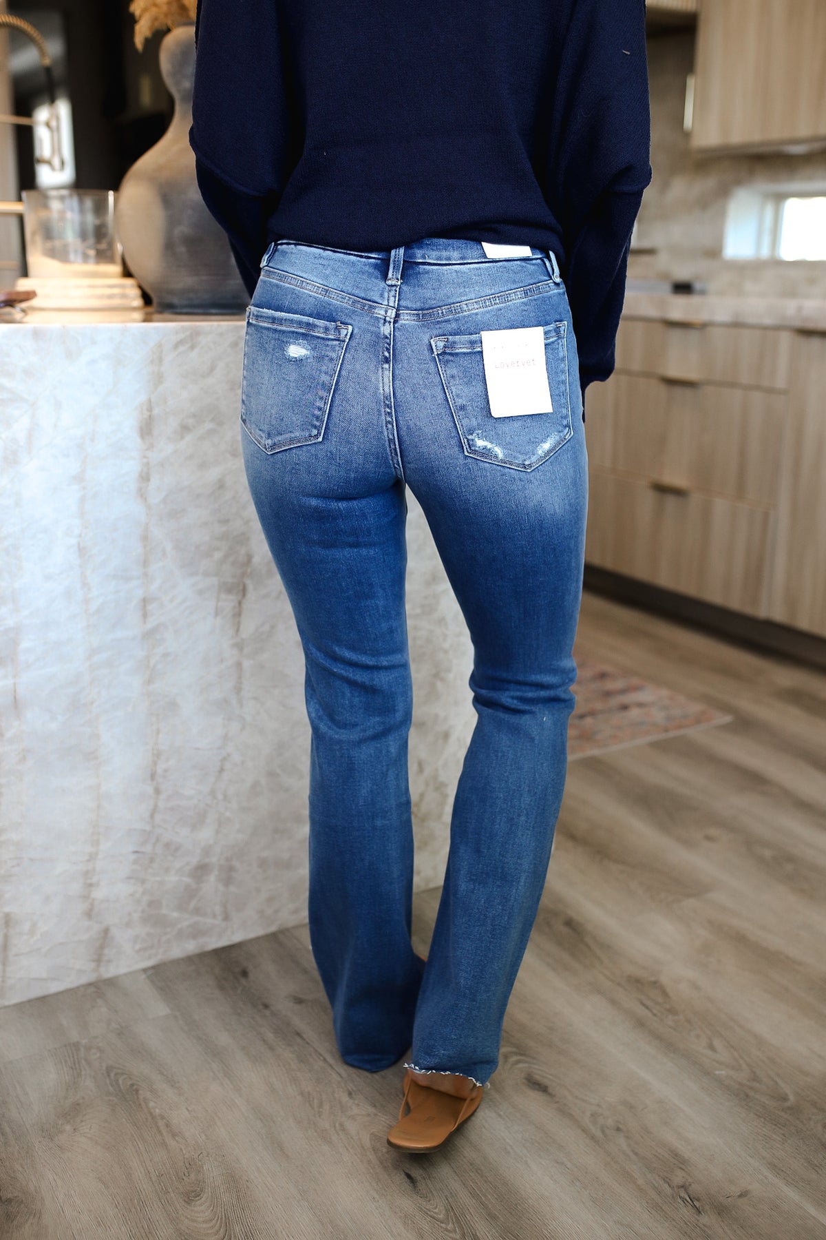 Comfort stretch denim, high rise waist, seamless waistband, clean cut raw hem, full length, bootcut jeans