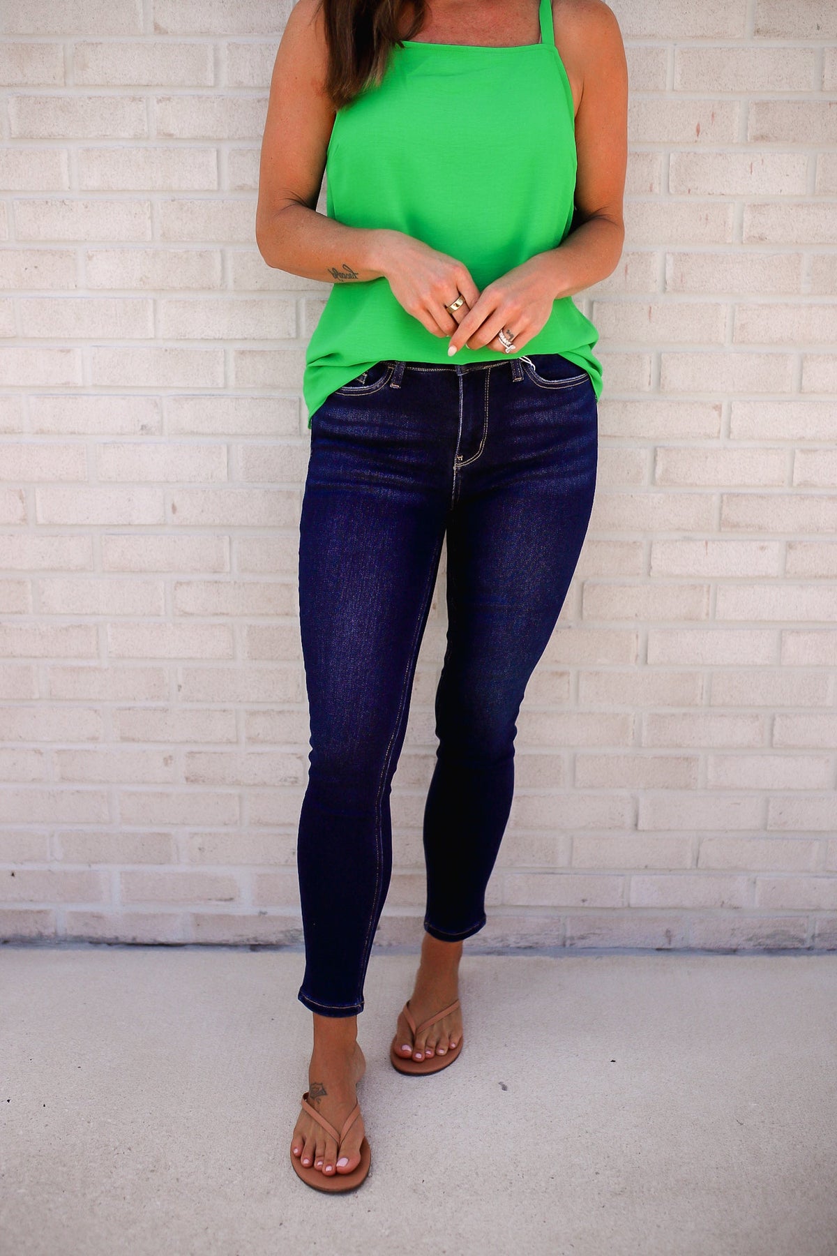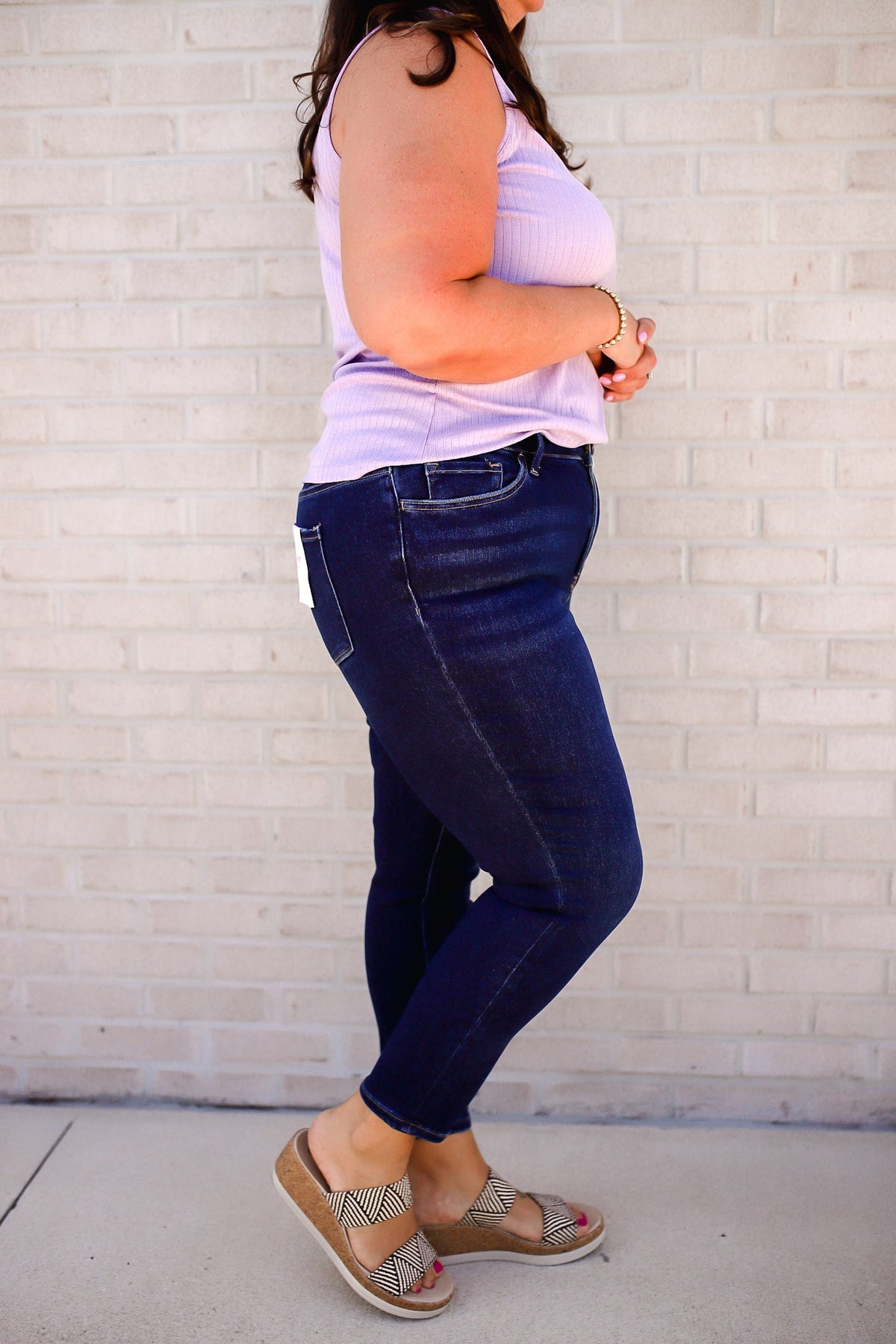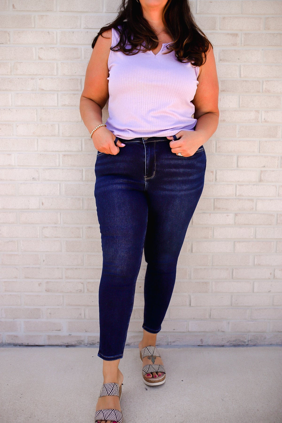 Comfort stretch denim, non-distressed, ankle length, dark wash, skinny jeans