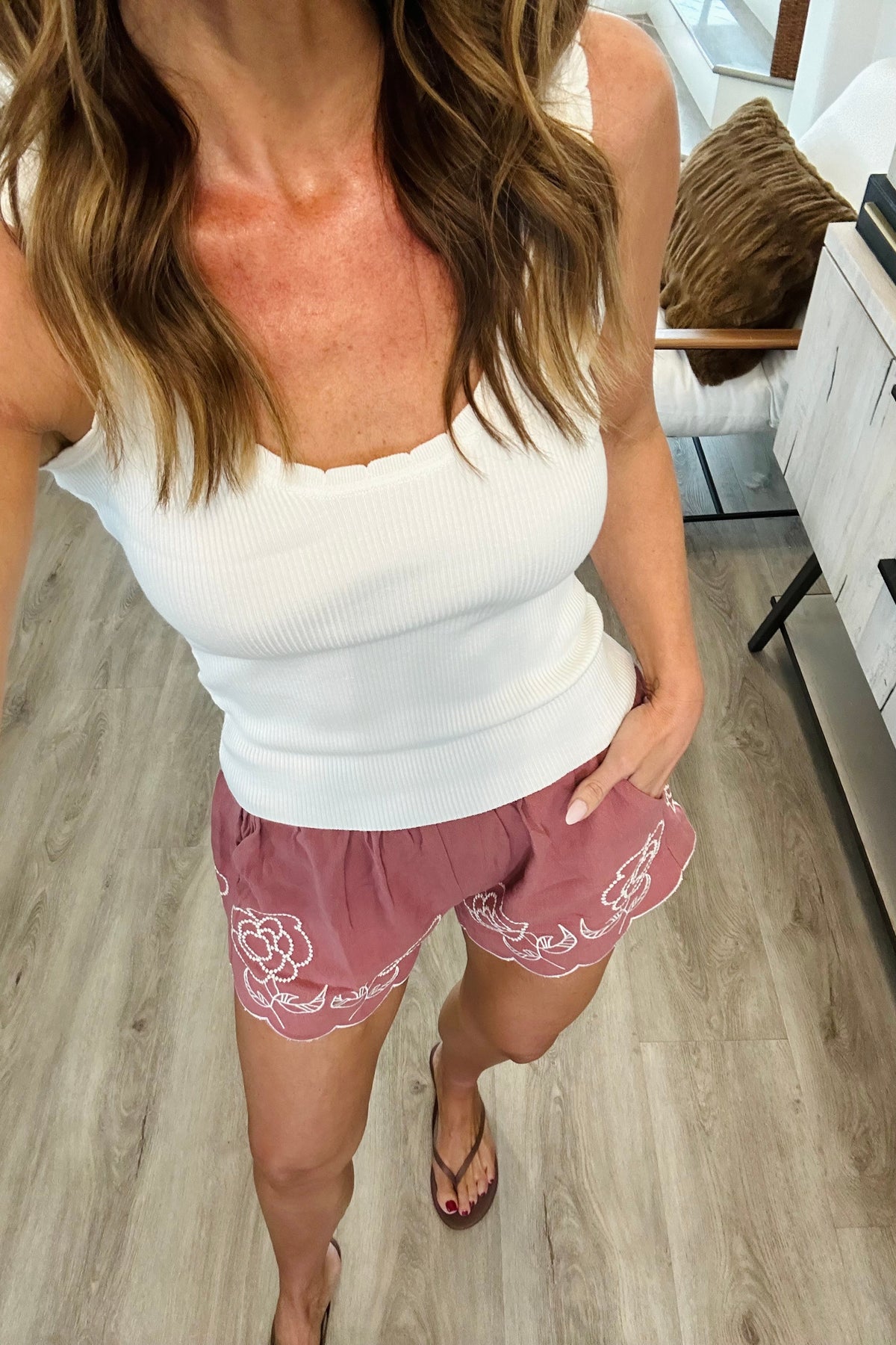 These linen blend shorts feature charming floral embroidered details for a touch of elegance. The lightweight and breathable fabric makes them perfect for staying cool in warm weather. Elevate your summer wardrobe with these stylish and feminine embroidered shorts.