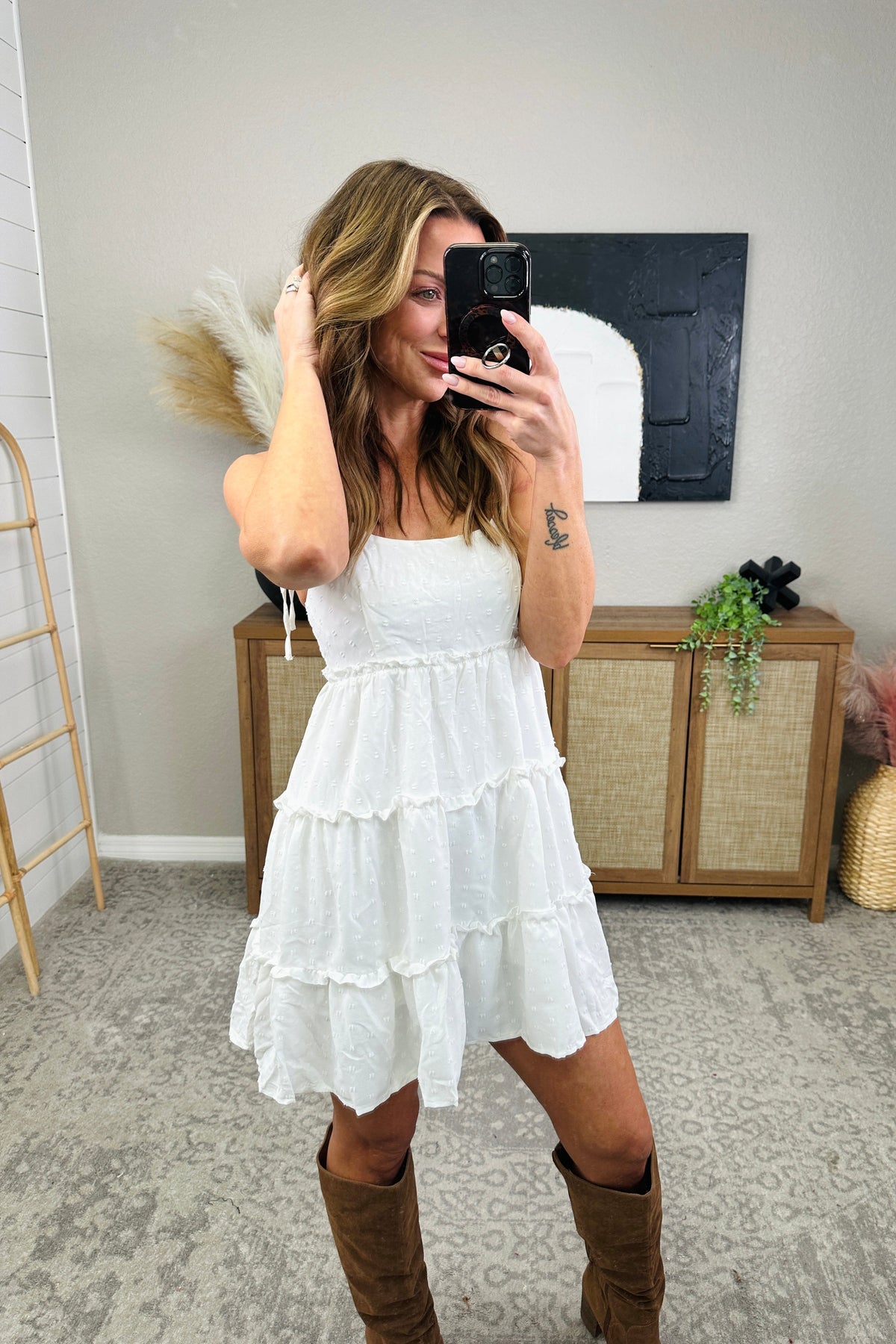 Upgrade your wardrobe with our Shiny Frill dress! Featuring an adjustable tie on the Spaghetti straps, this tiered dress is both stylish and versatile. Perfect for any occasion, this dress will have you looking and feeling fabulous! The model is in the medium.