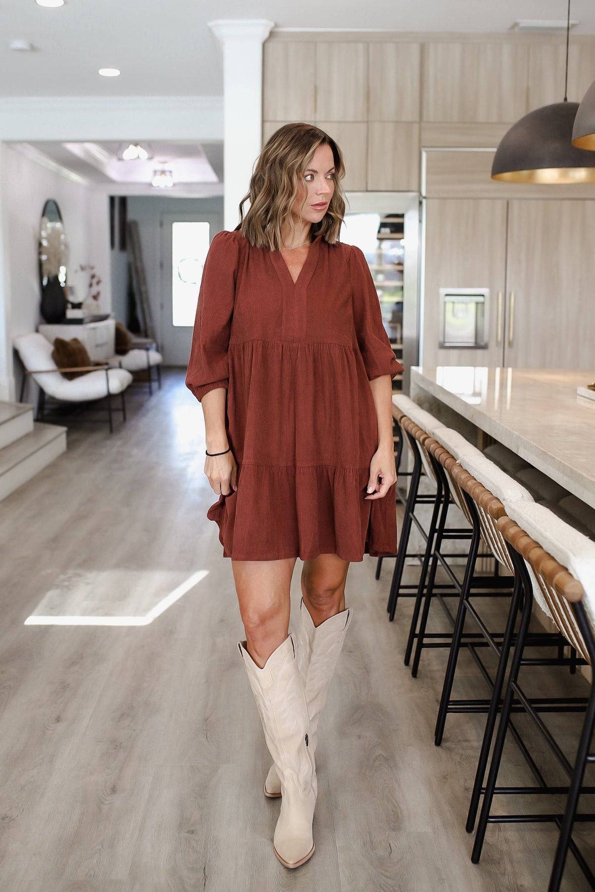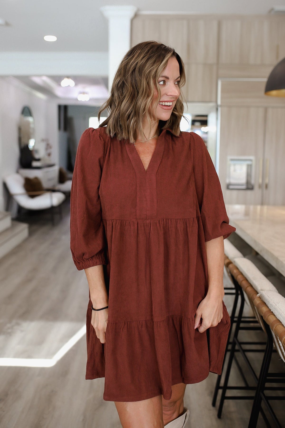 The Tiered Corduroy Mini Dress with Balloon Sleeves is a charming and whimsical piece perfect for a vintage-inspired look. The tiered design adds dimension and movement to the dress, while the balloon sleeves provide a touch of drama. The corduroy fabric gives it a cozy and textured feel, making it ideal for fall and winter styling. Embrace retro vibes with this adorable mini dress featuring tiered layers and statement balloon sleeves.