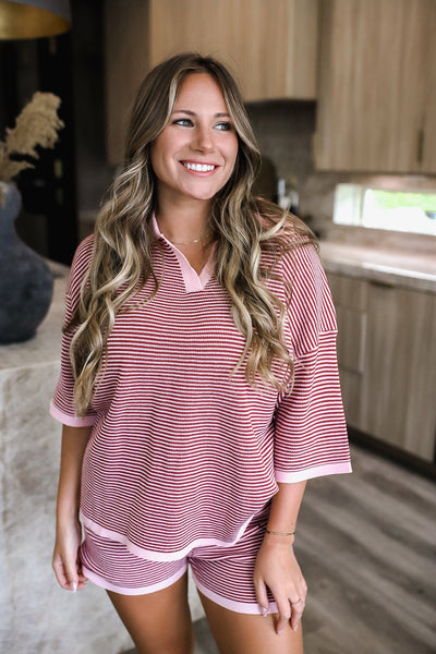Collared Neck Contrast Striped Top and Shorts Sweater Set