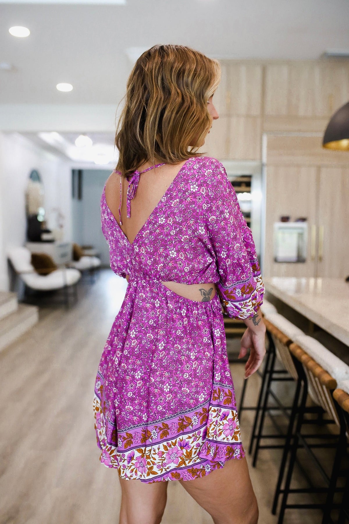 Flirty meets free-spirited in the Tied Front Cutout Printed Romper. Featuring a bold purple paisley design, this one-piece stunner is all about standout details—from the flirty front tie and peekaboo cutout to the relaxed fit that keeps you comfy and cute. With adjustable straps and a breezy silhouette, it’s perfect for festivals, girls’ night, or any sun-soaked adventure. Just add boots or slides and let the print do the talking. The model is in the medium for length.
