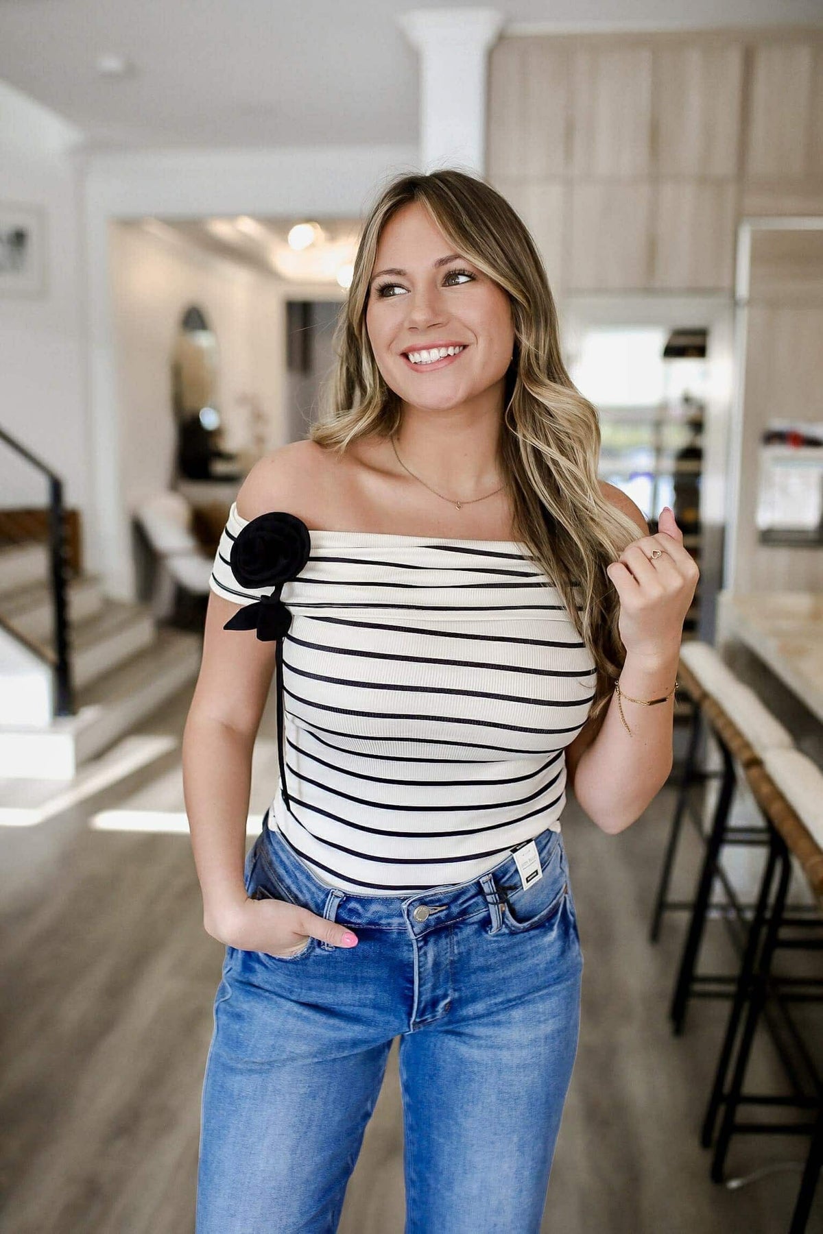 Perfee Striped Off-Shoulder Short Sleeve T-Shirt