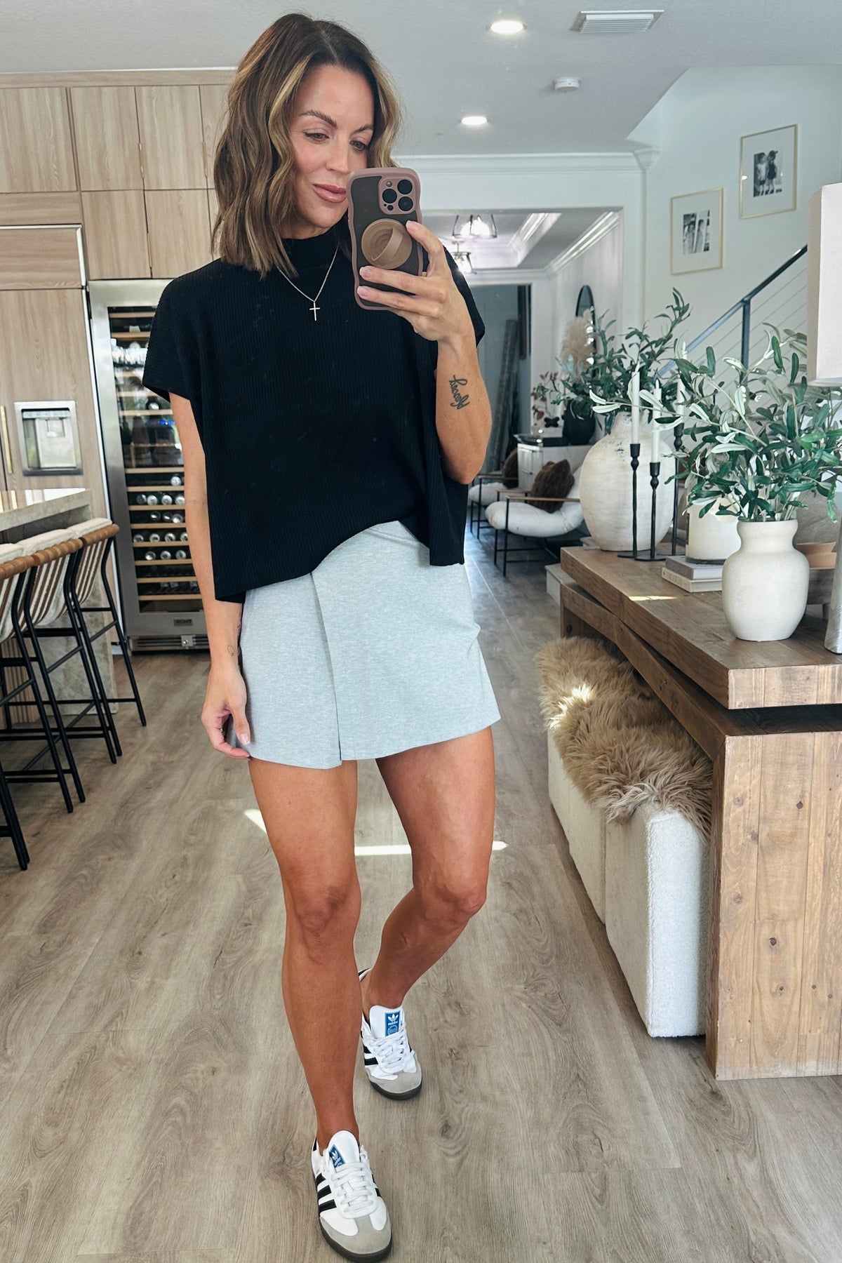 This stylish ribbed pullover sweater features a modern mock neck design with short sleeves, crafted from soft knit fabric in a versatile charcoal gray color. The relaxed boxy fit and cropped length create a contemporary silhouette perfect for layering or wearing alone. The ribbed texture adds visual dimension while the lightweight material makes it ideal for year-round wear. Easy to style with high-waisted jeans, skirts, or layered under jackets for a chic, effortless look.