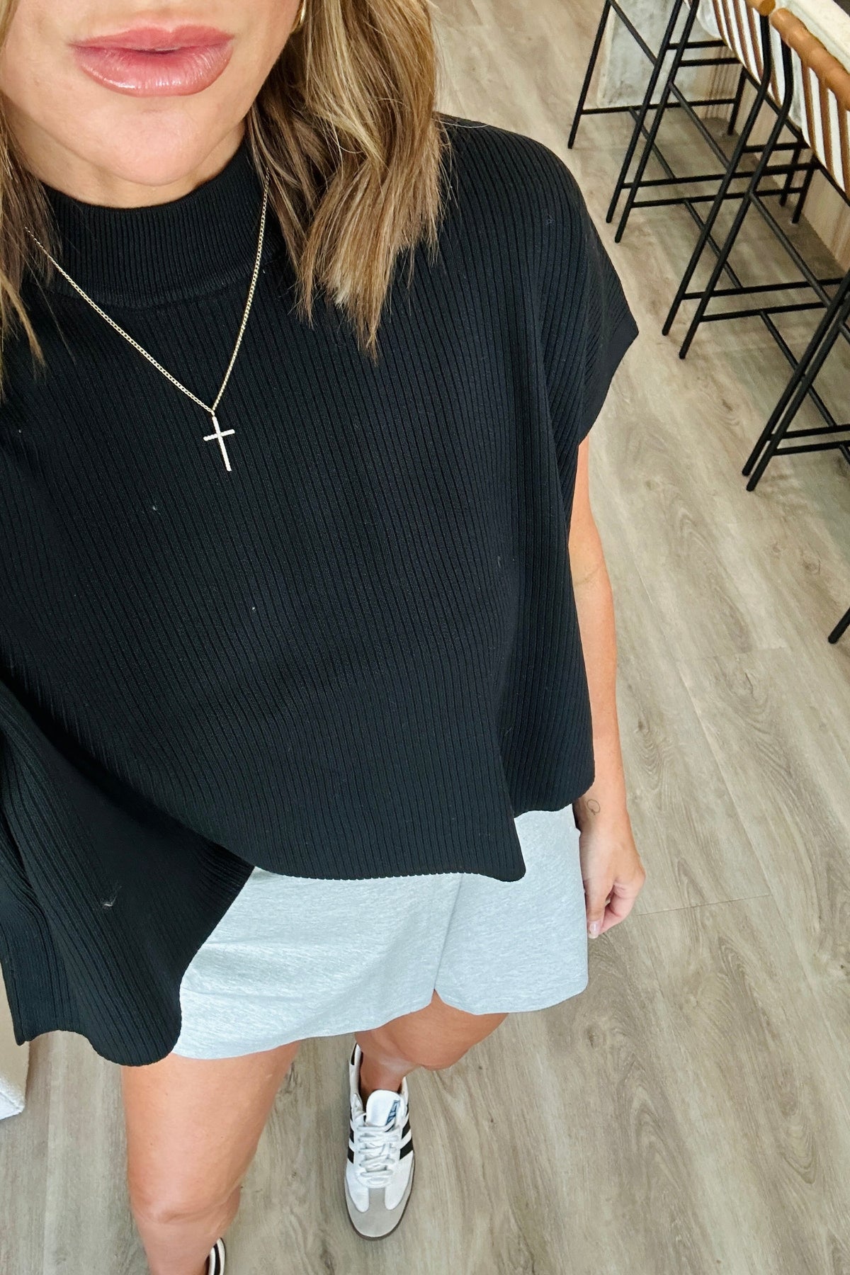 This stylish ribbed pullover sweater features a modern mock neck design with short sleeves, crafted from soft knit fabric in a versatile charcoal gray color. The relaxed boxy fit and cropped length create a contemporary silhouette perfect for layering or wearing alone. The ribbed texture adds visual dimension while the lightweight material makes it ideal for year-round wear. Easy to style with high-waisted jeans, skirts, or layered under jackets for a chic, effortless look.