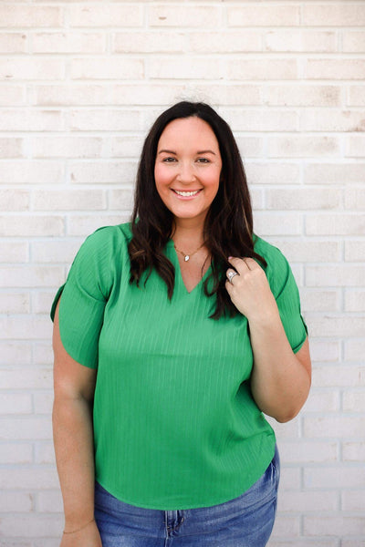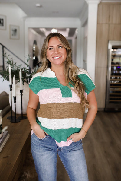 Double Take Full Size Striped V-Neck Short Sleeve Sweater
