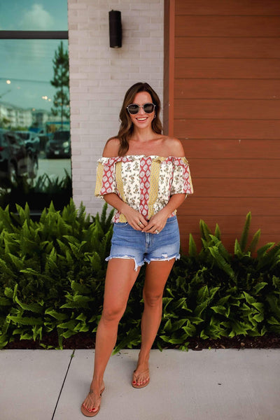 Ruffled Printed Off-Shoulder Short Sleeve Blouse