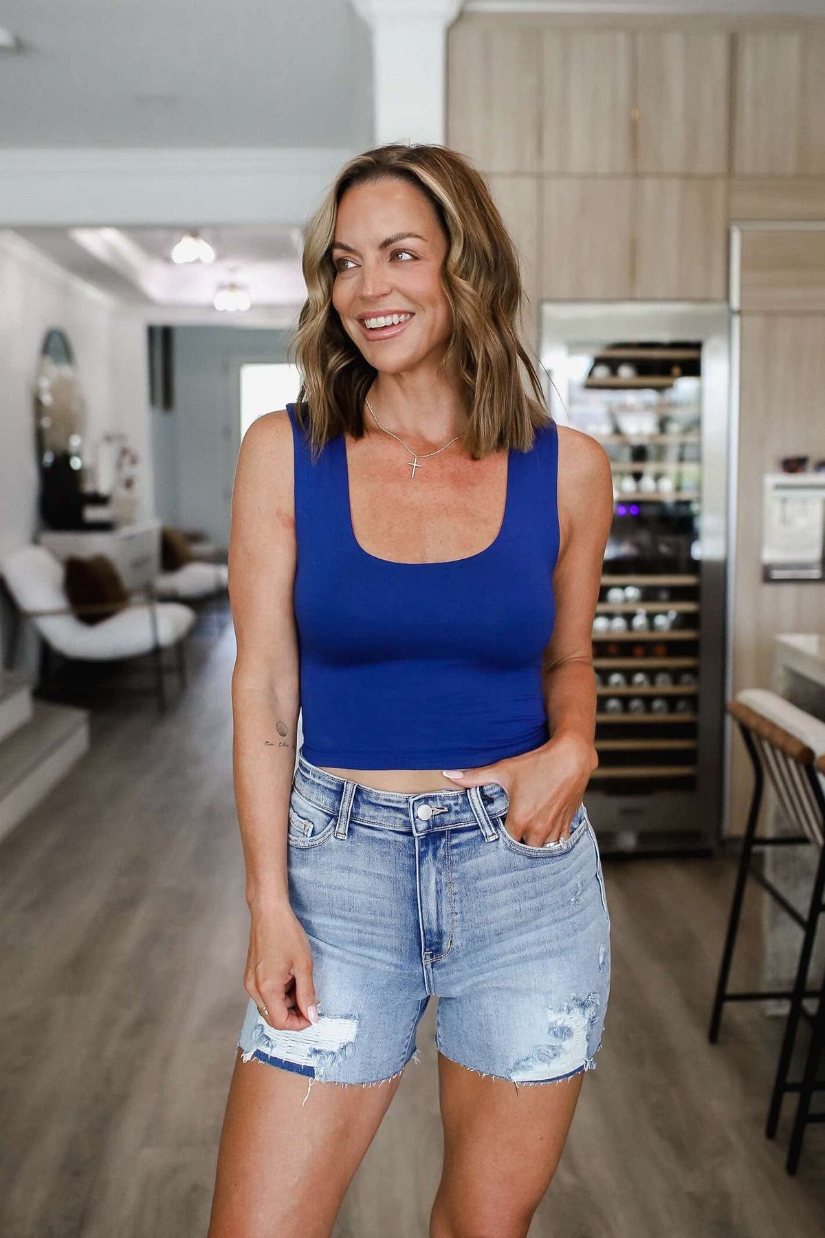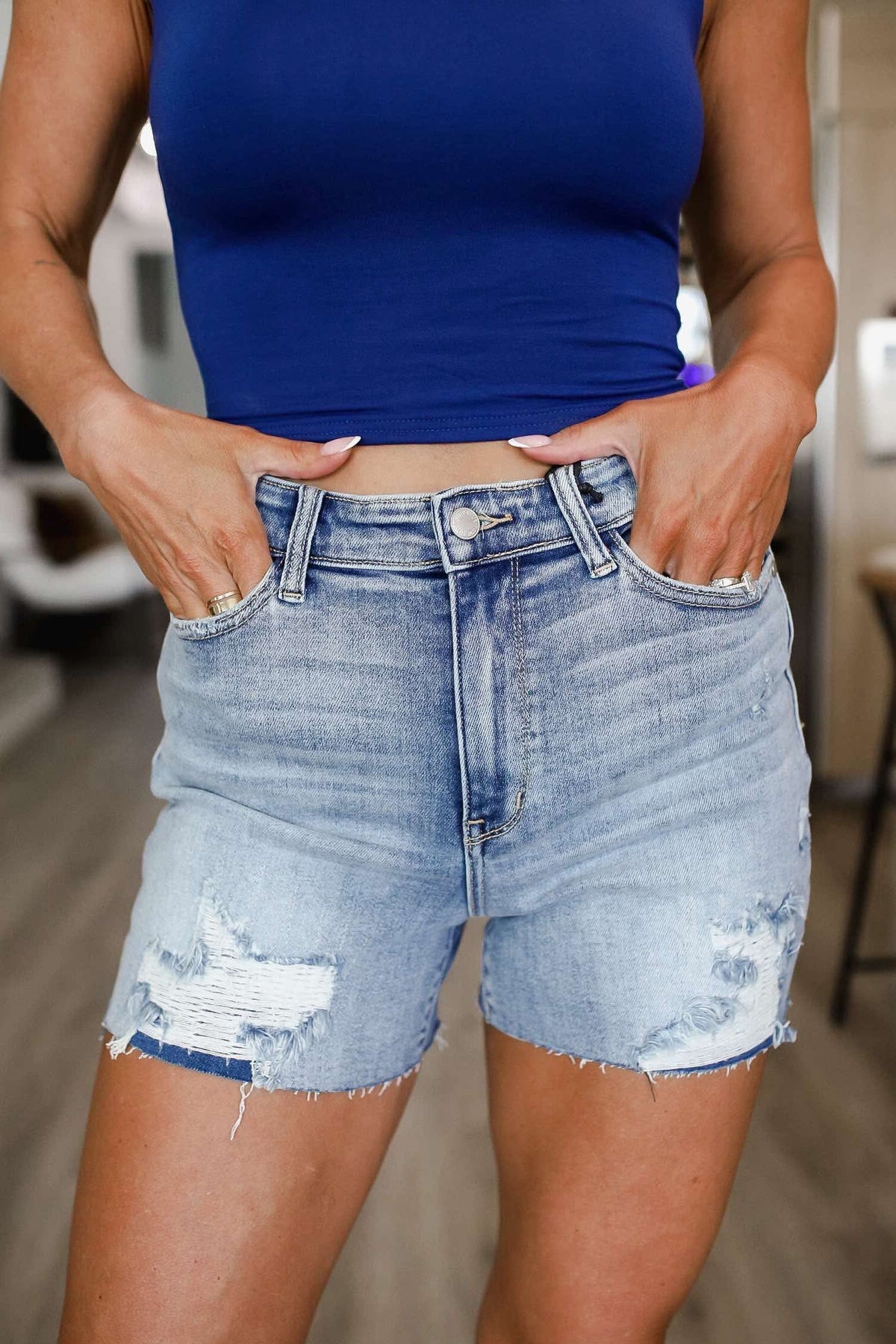 These fashion high-waisted denim shorts feature a classic light blue wash with modern distressed details. Made from premium quality cotton blend denim with added stretch for comfort. The shorts showcase strategic distressing and raw hem details for an effortlessly cool look. The high-rise waist provides a flattering fit, while the traditional 5-pocket design maintains classic styling. Perfect for casual summer wear, these shorts combine style with comfort through their carefully crafted design and durable construction. The model is in the medium.