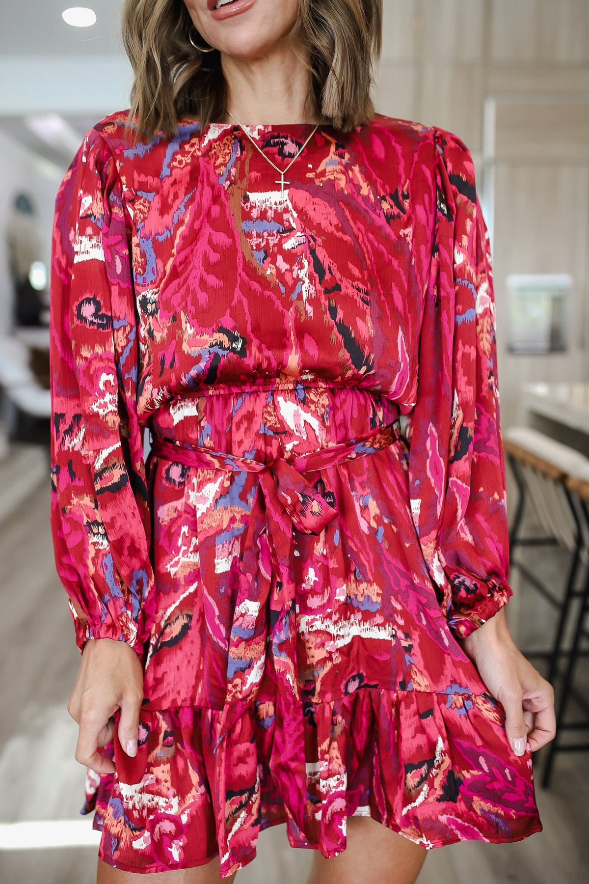 This stunning floral print dress features a romantic red base with vibrant botanical patterns throughout. Crafted from lightweight flowing fabric, it offers comfort and style with long sleeves, a flattering tie waist that accentuates your silhouette, and a playful ruffle hem that adds movement and charm. Perfect for casual outings, date nights, or seasonal celebrations, this versatile piece combines feminine elegance with contemporary fashion trends. The model is in the small. Paired with Risen Oversized Denim Jacket.