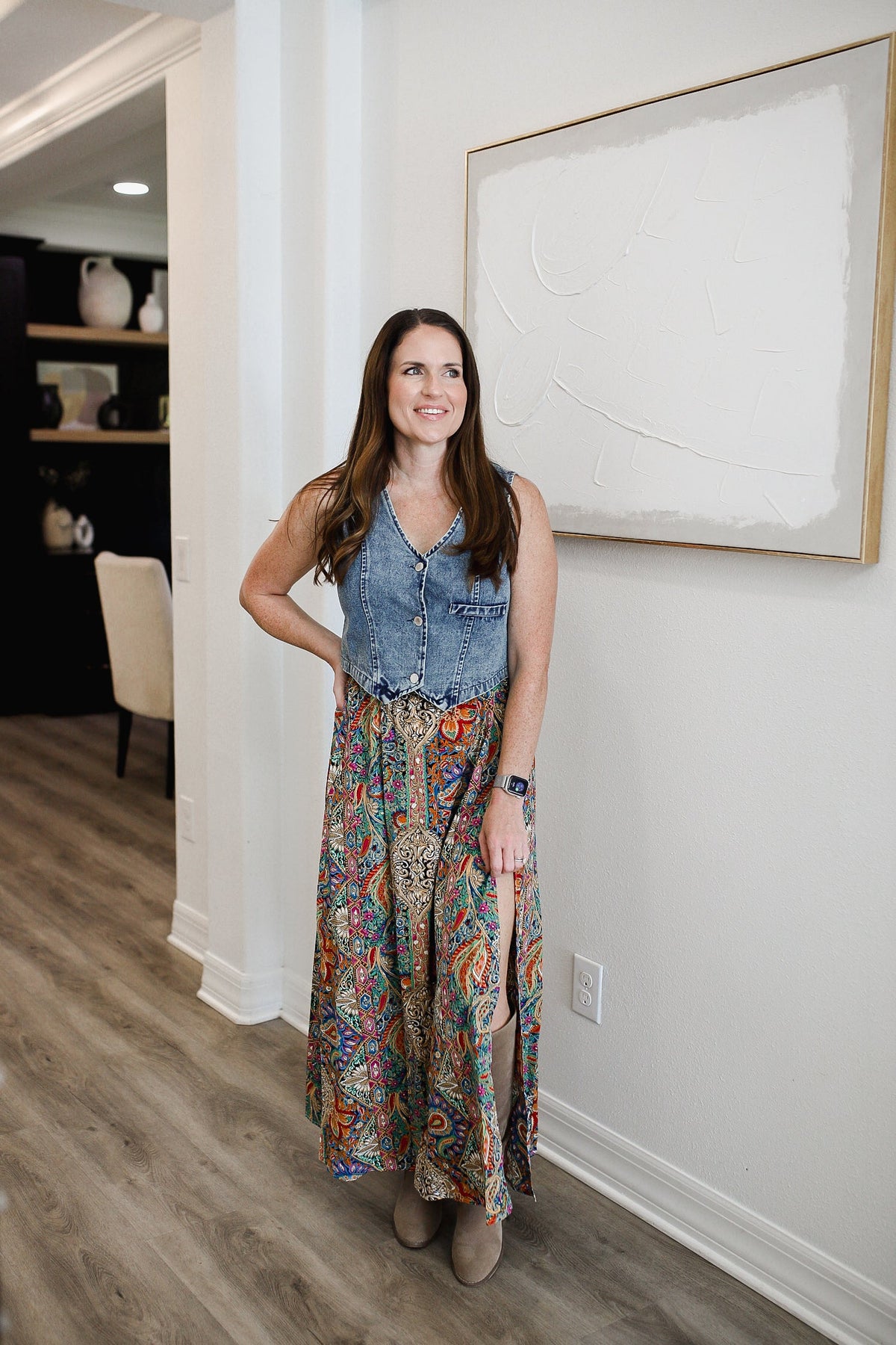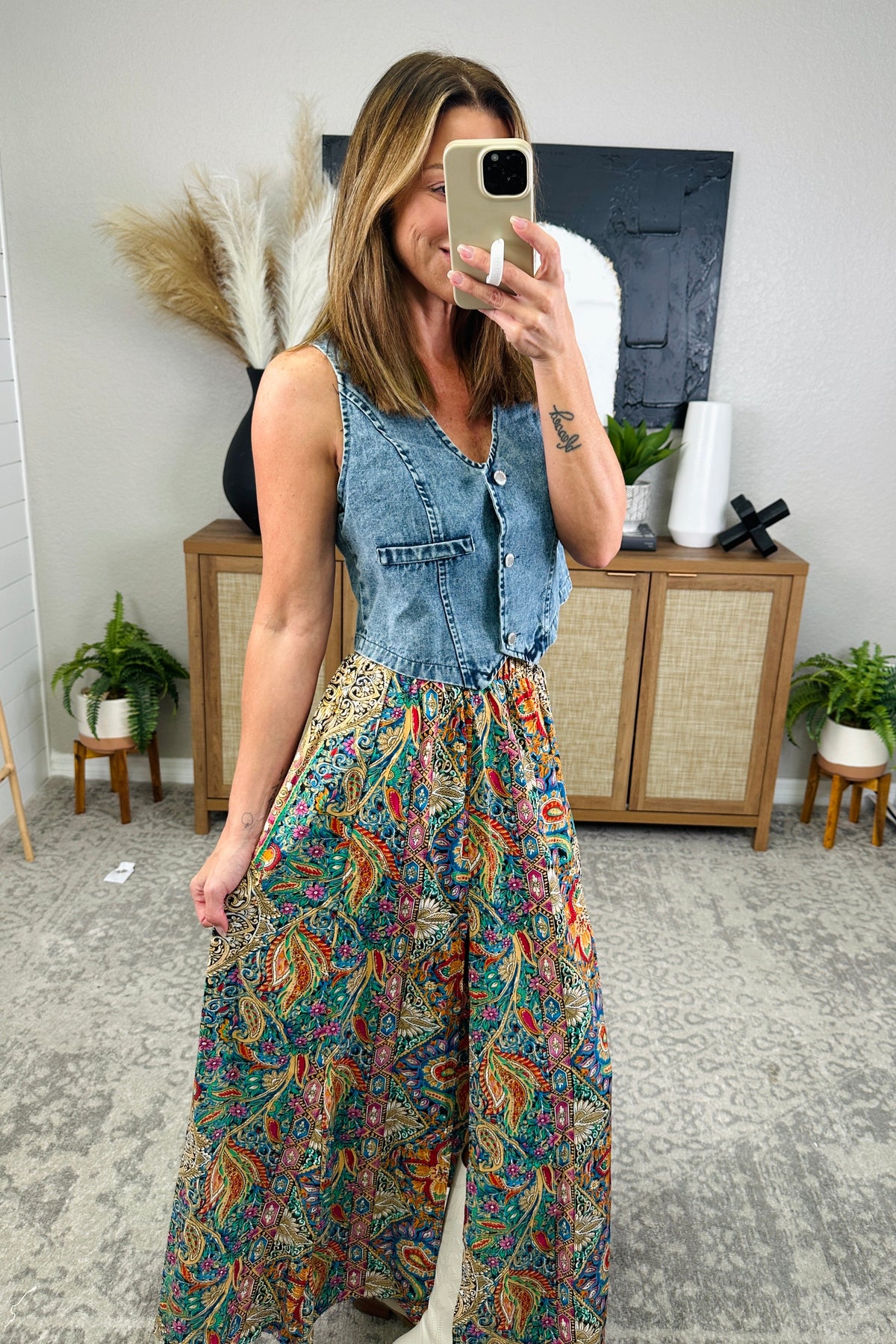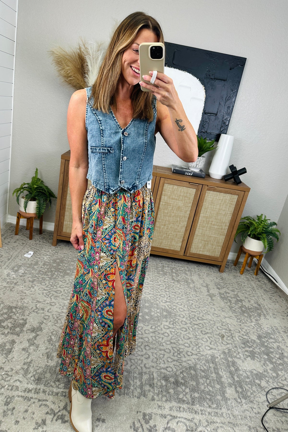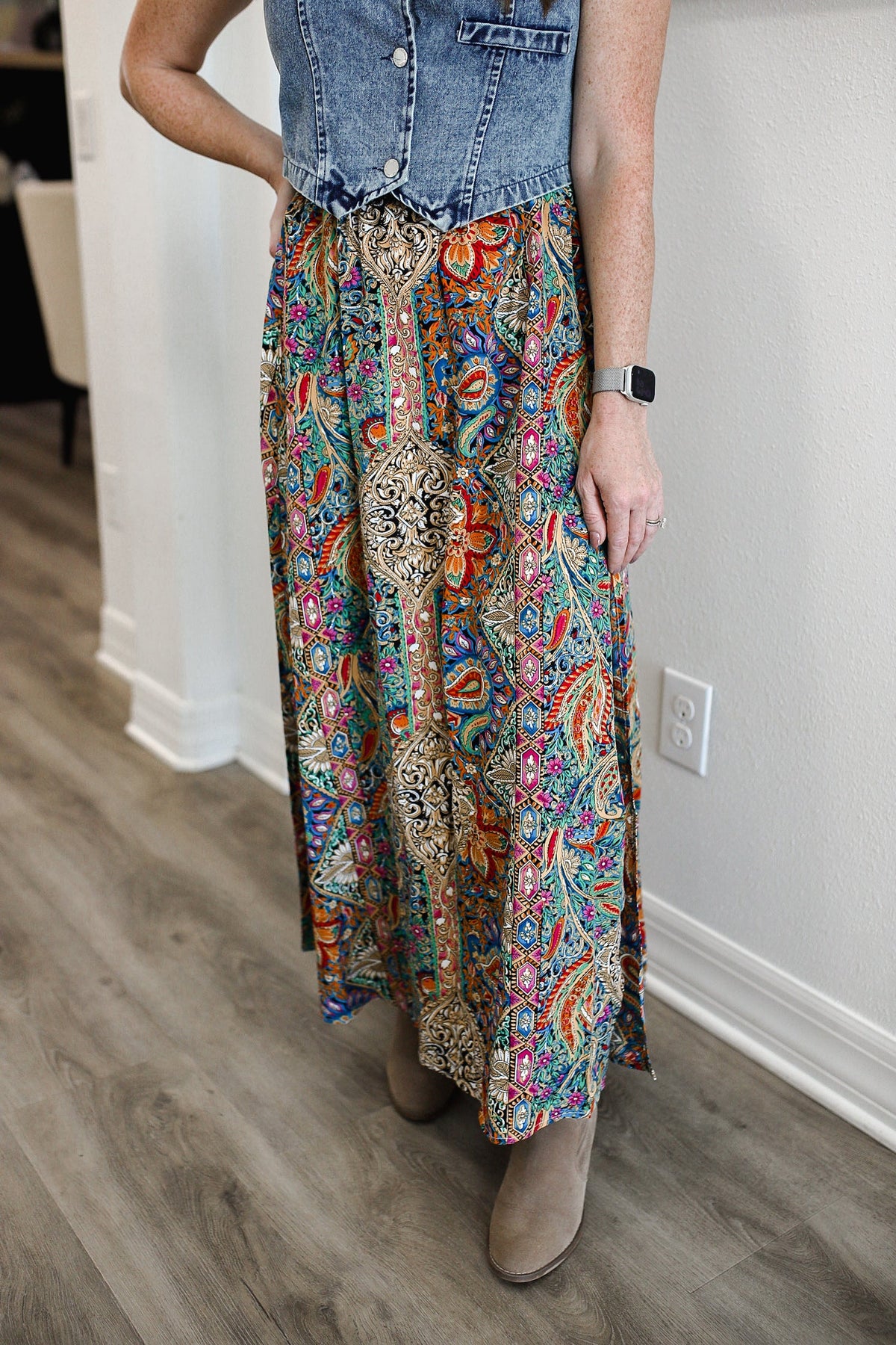 Shake up your wardrobe with our Slit Printed Elastic Waist Skirt! This playful piece boasts a unique print and a comfortable elastic waist for effortless style. Stay bold, stay comfortable, and stay fabulous with our quirky skirt. The model is in the "gold", paired with Buttoned V-Neck Denim top. The model is in the medium.