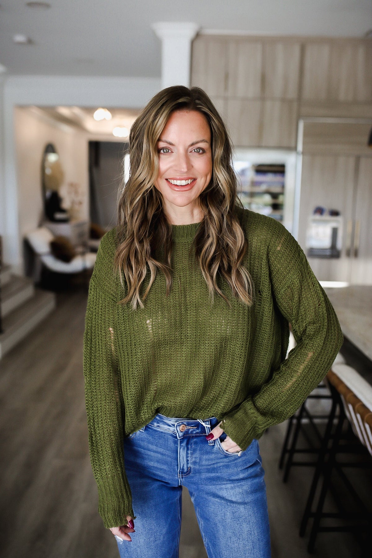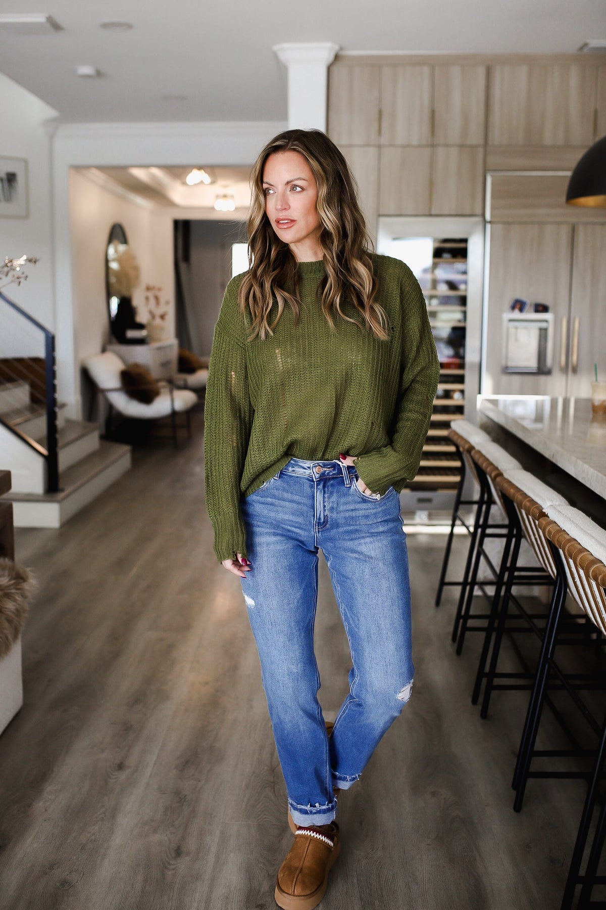 This piece features distressed detailing for an effortlessly chic look that remains timeless. With a crew neck, drop shoulders, and long sleeves, it combines style and comfort seamlessly. The relaxed fit enhances its laid-back vibe, making it perfect for casual outings or lounging at home. Pair it with your favorite jeans or leggings for a trendy yet comfortable ensemble that you can wear all season long! Paired with the Sandra jeans.