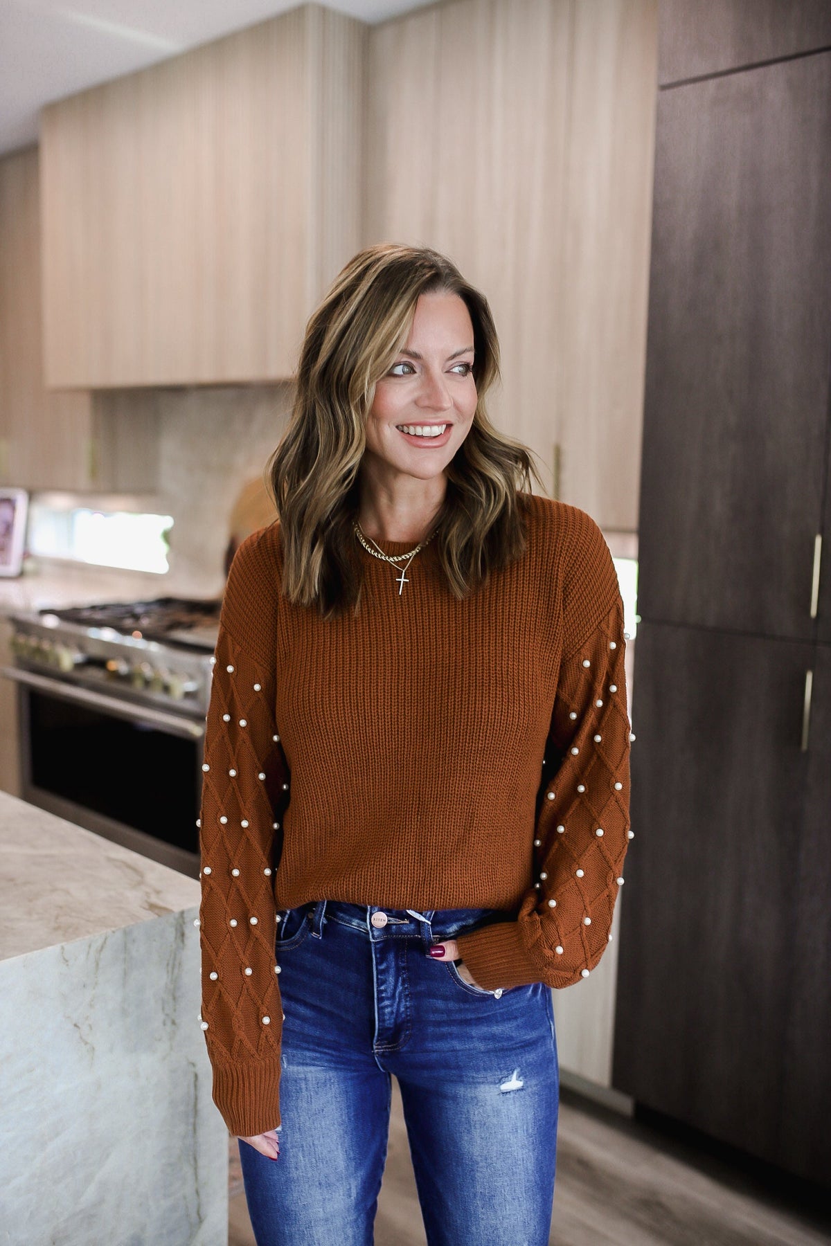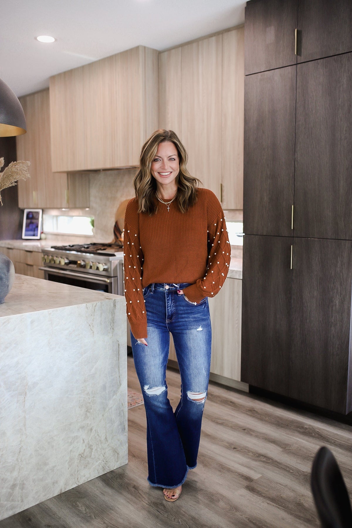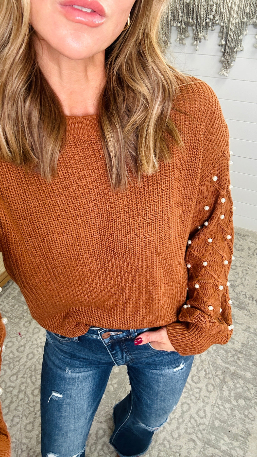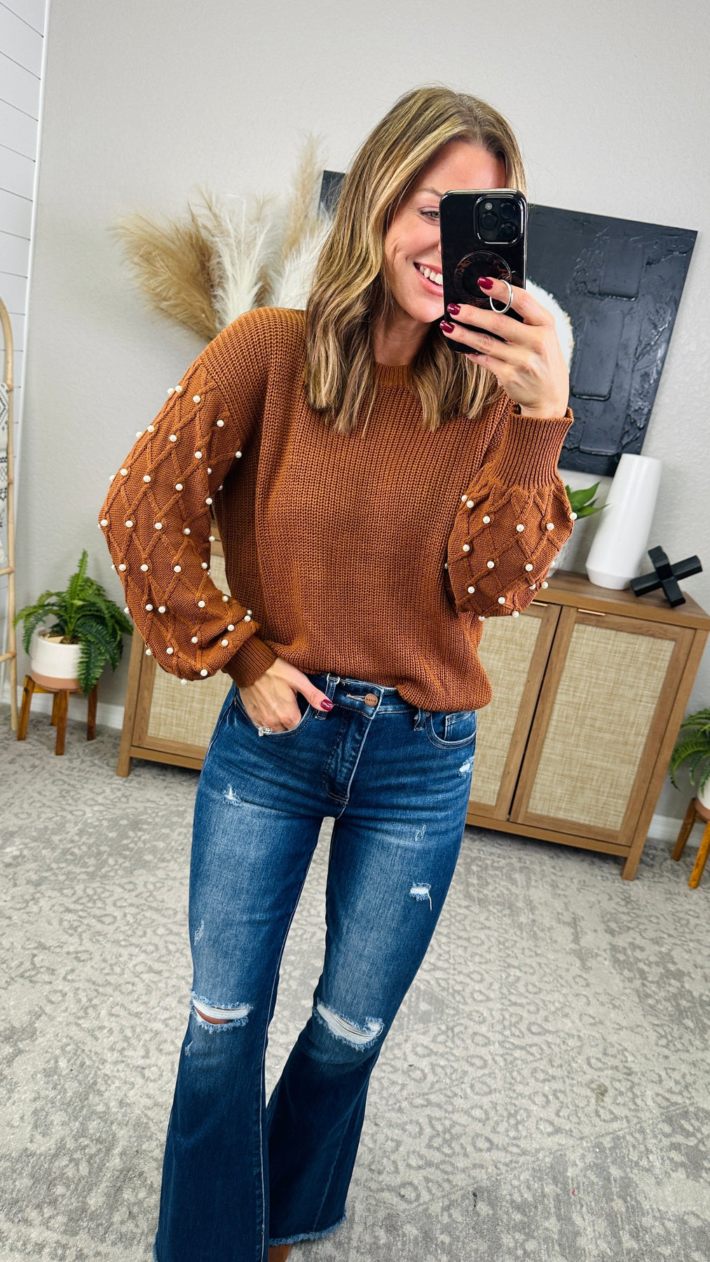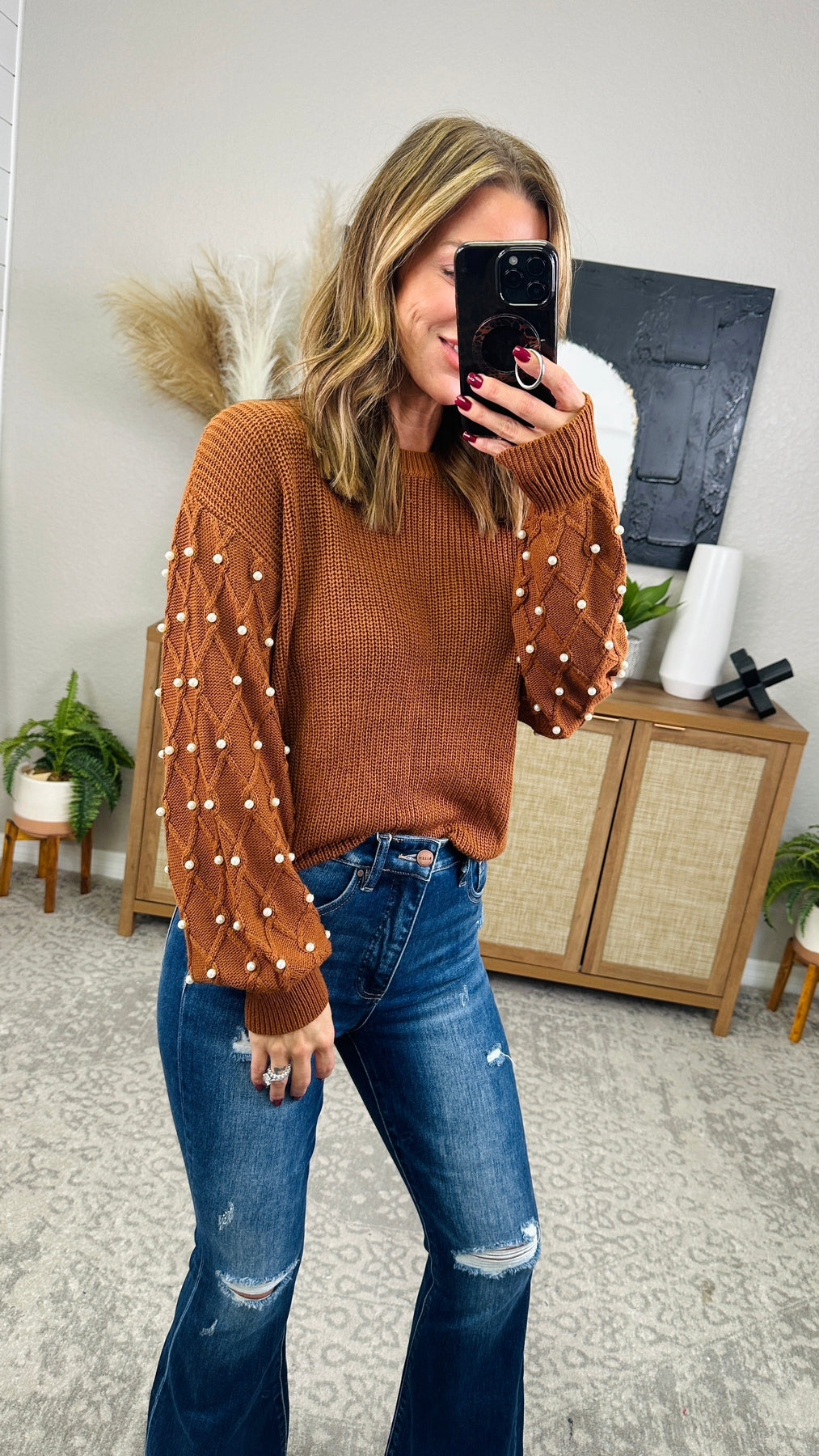 The Pearl Detail Sweater adds a touch of elegance with its round neck and long sleeves adorned with delicate pearls. Stay warm and stylish with this cozy sweater for any occasion. Perfect for a playful yet polished look. *Paired with RISEN Full Size High Rise Distressed Raw Hem Flare Jeans.