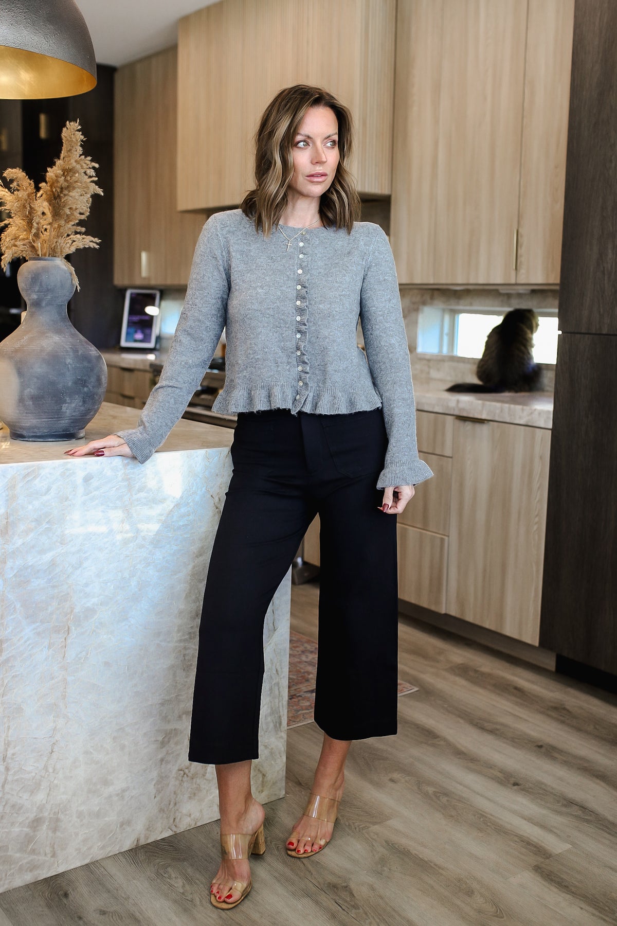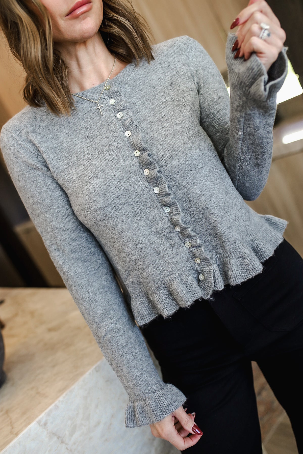 Effortless style meets everyday comfort in this charming long sleeve knit top. Crafted from lightweight, breathable knit fabric, it features a classic button-down front paired with playful ribbed ruffled details along the hem, cuffs, and placket. The perfect piece for layering or wearing solo, this versatile solid knit top transitions seamlessly from casual weekends to relaxed workdays. Simple, sweet, and endlessly wearable.