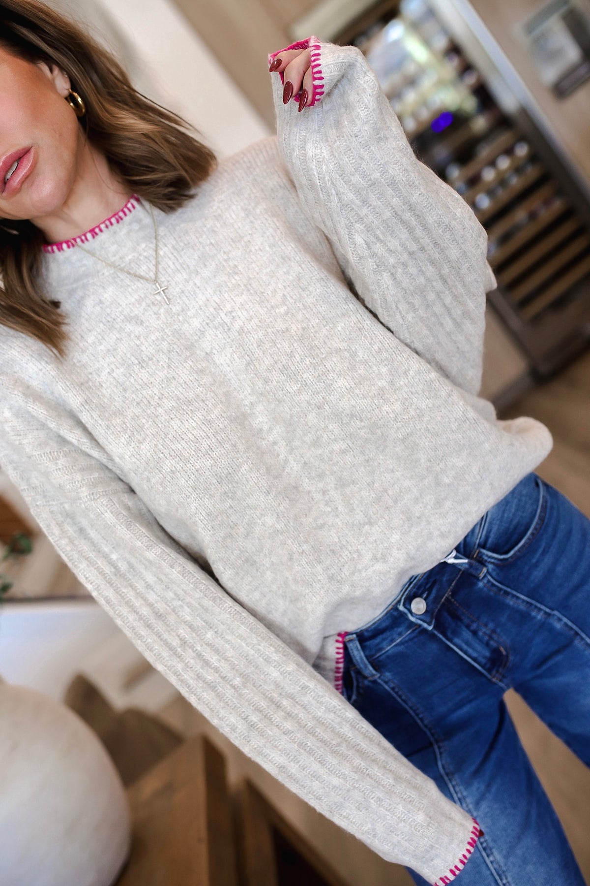 A long sleeve solid knit top with a mock neck featuring contrast knit lining and a relaxed fit. Fabric is a lightweight knit. 81% POLYESTER 16% ACRYLIC 3% SPANDEX