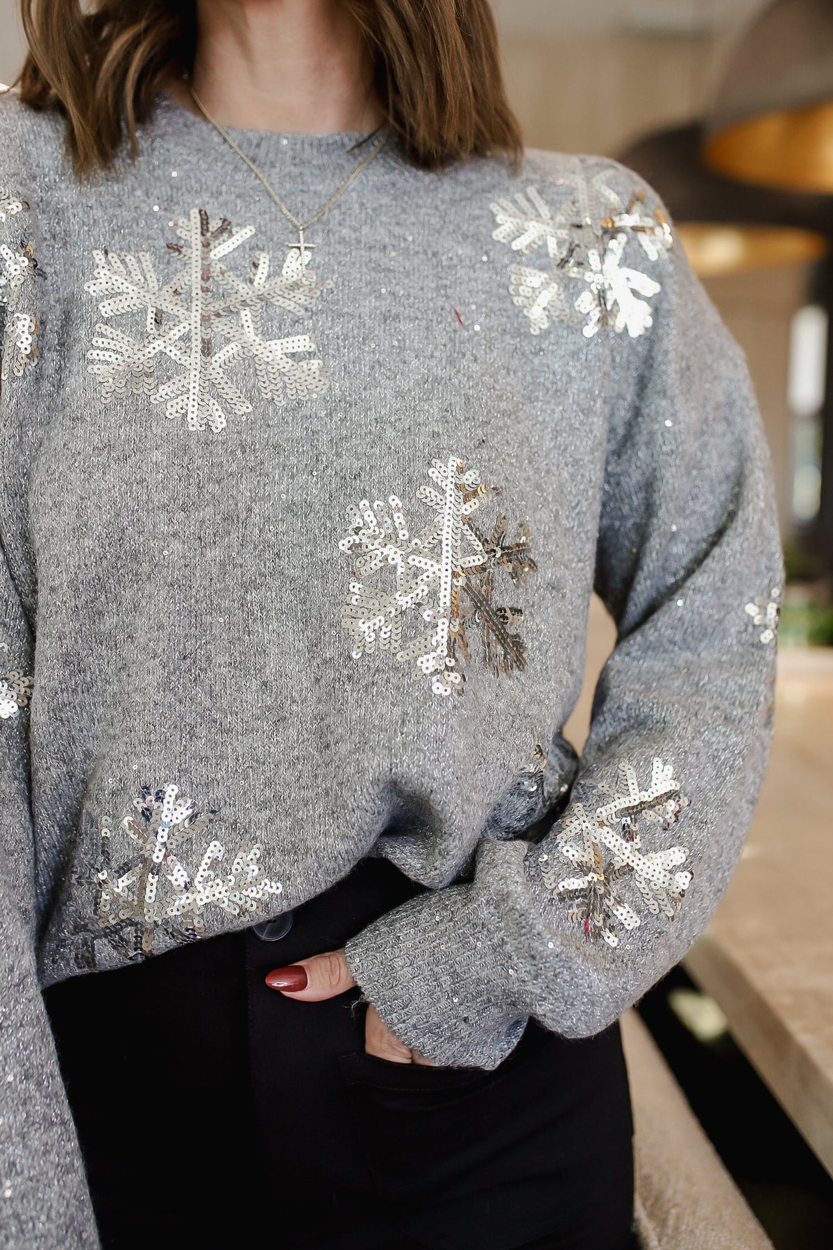 Wrap yourself in cozy charm with this Winter Babe long sleeve sweater. Crafted from lightweight knit fabric, it features a classic round neckline elevated by shimmering sequin star flake details that catch the light beautifully. The true-to-size fit ensures a comfortable, flattering silhouette perfect for layering or wearing solo. Whether you're heading out for a winter adventure or settling in for a cozy night, this playful piece brings a touch of sparkle to your everyday style. A wardrobe essential that's equal parts comfort and whimsy.