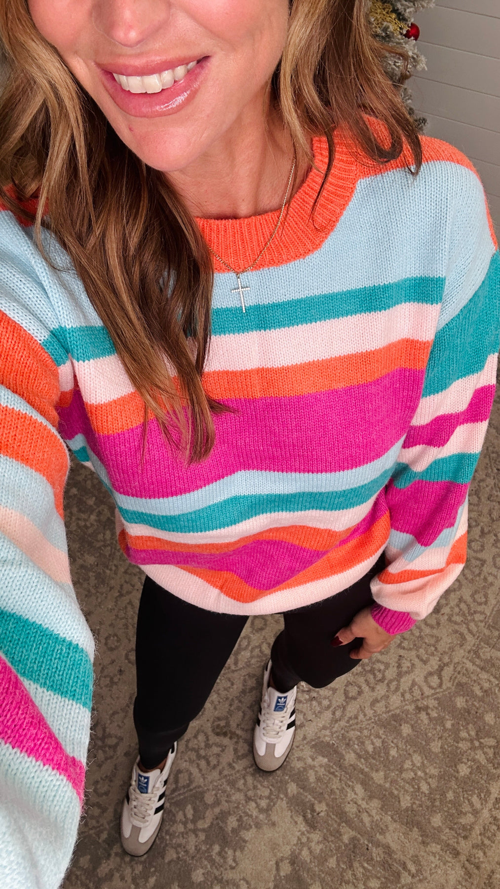 This bright sweater will definitely add some color to your wardrobe! With its playful striped design and trendy drop shoulder style, you'll stand out in the most charming way possible. Stay warm and stylish this season with the Striped Round Neck Drop Shoulder Sweater. The model is in the small.