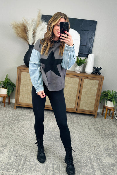 Double Take Full Size Star Pattern Raw Edge Long Sleeve Sweater