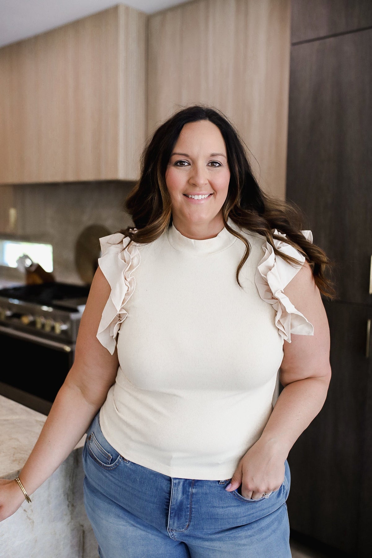 Ruffle Flutter Sleeve Mock Neck Ribbed Top