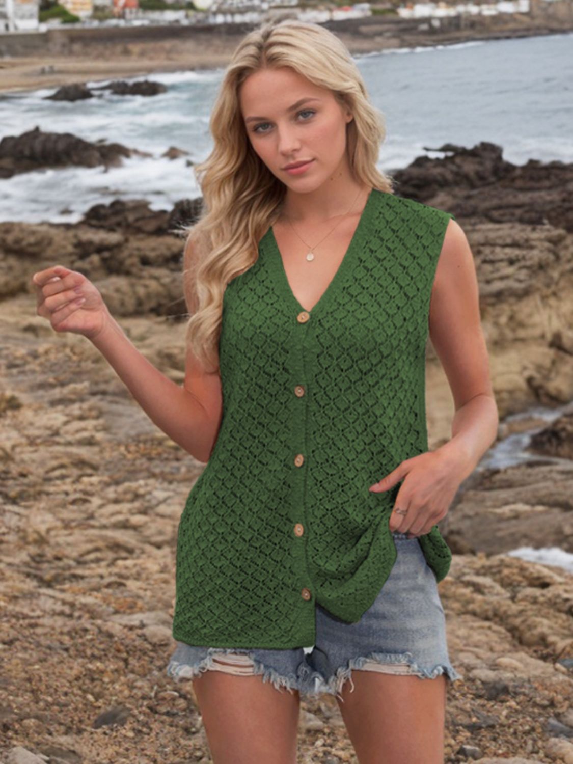 Button Down Eyelet V-Neck Sweater Vest
