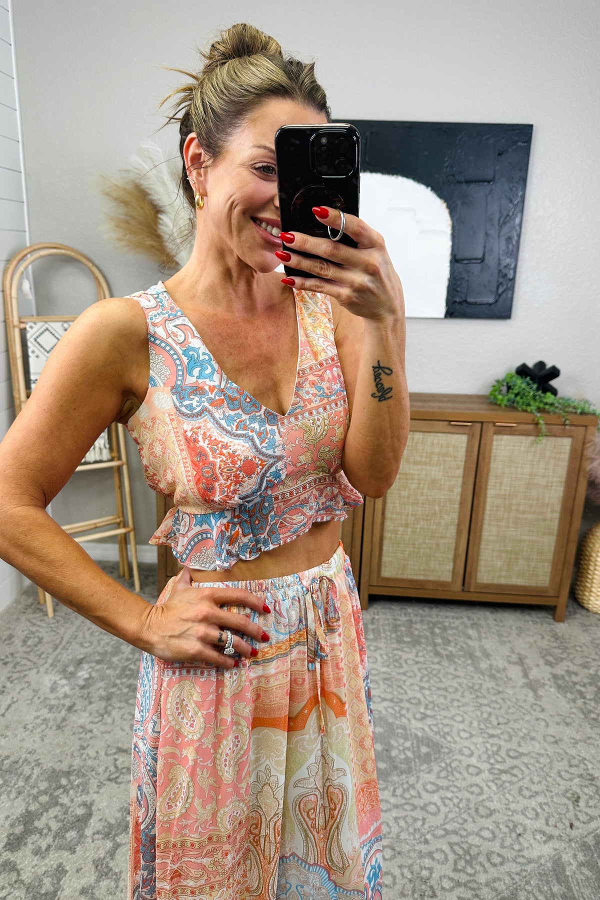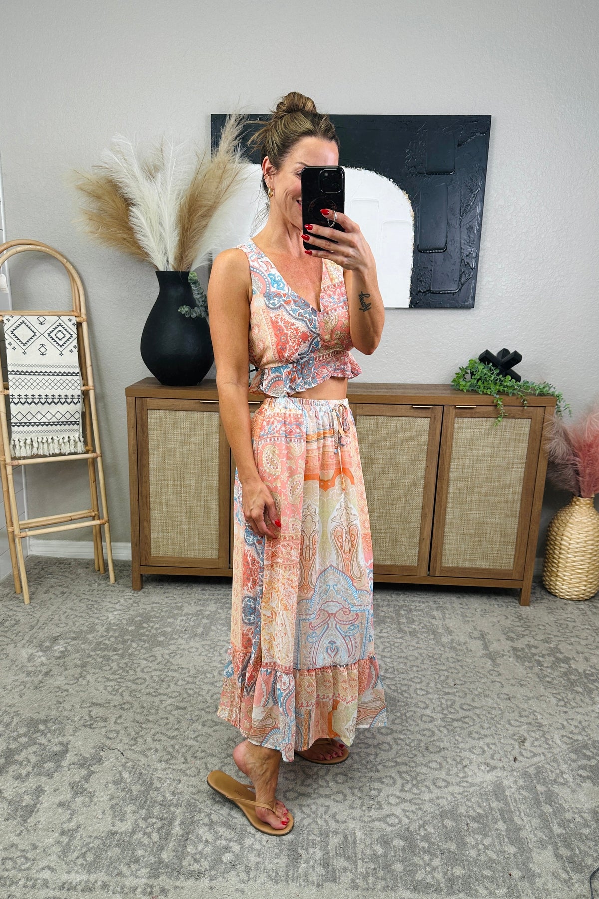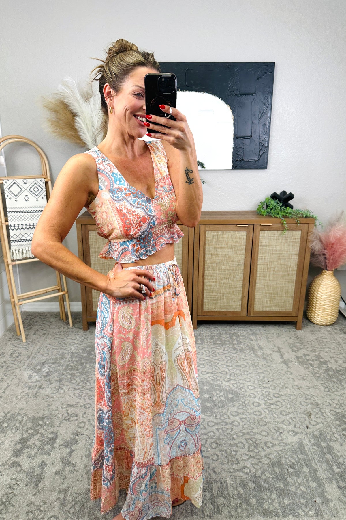 This trendy BOHO top and midi skirt set is perfect for your next outing. The playful print and v-neck add a touch of fun, while the midi skirt offers comfort and style. Get ready to turn heads with this quirky and stylish outfit!