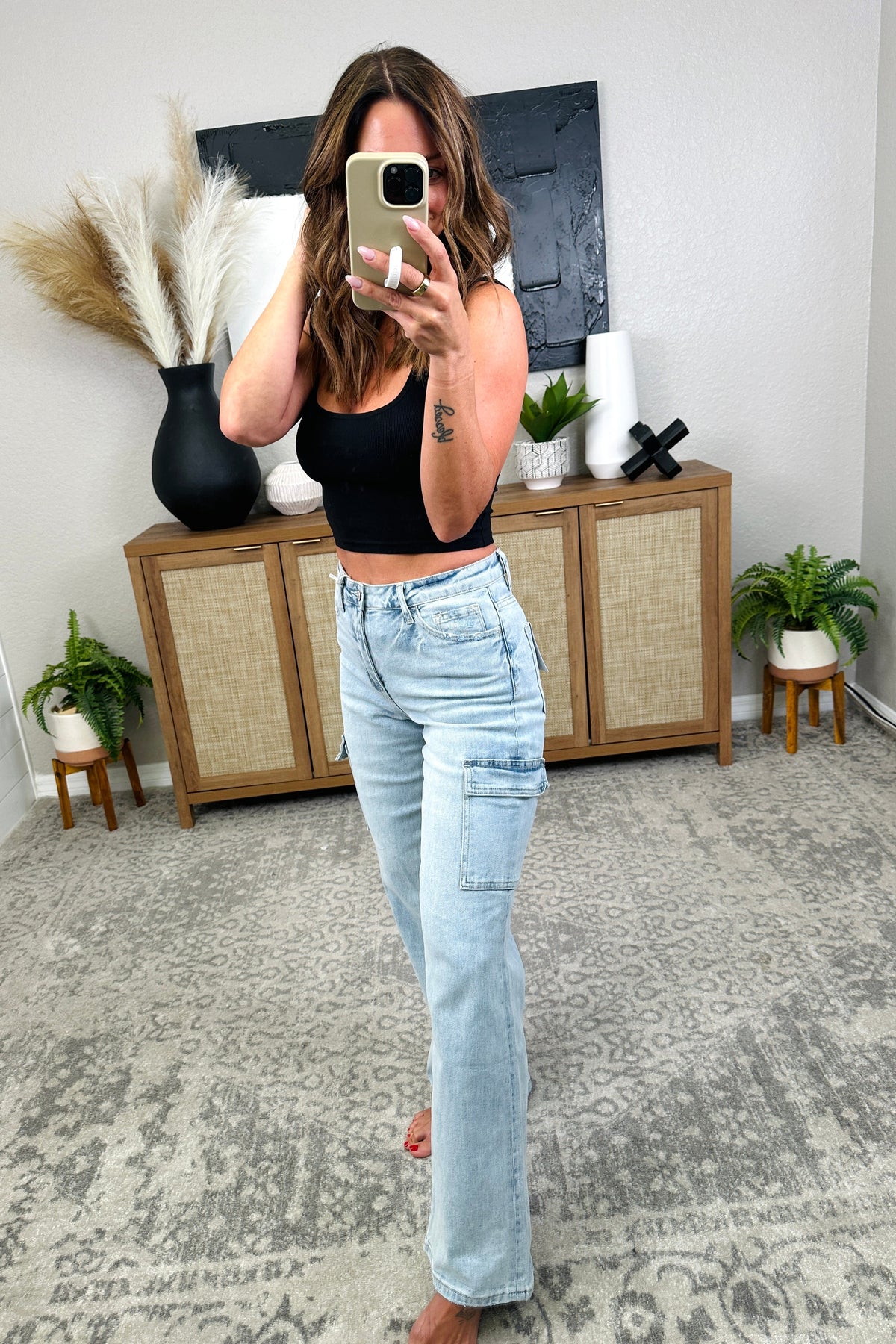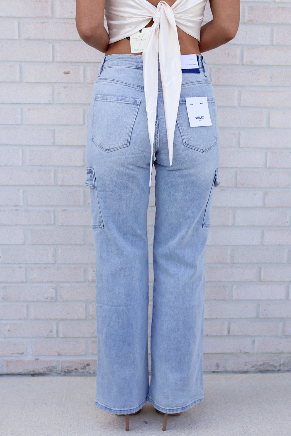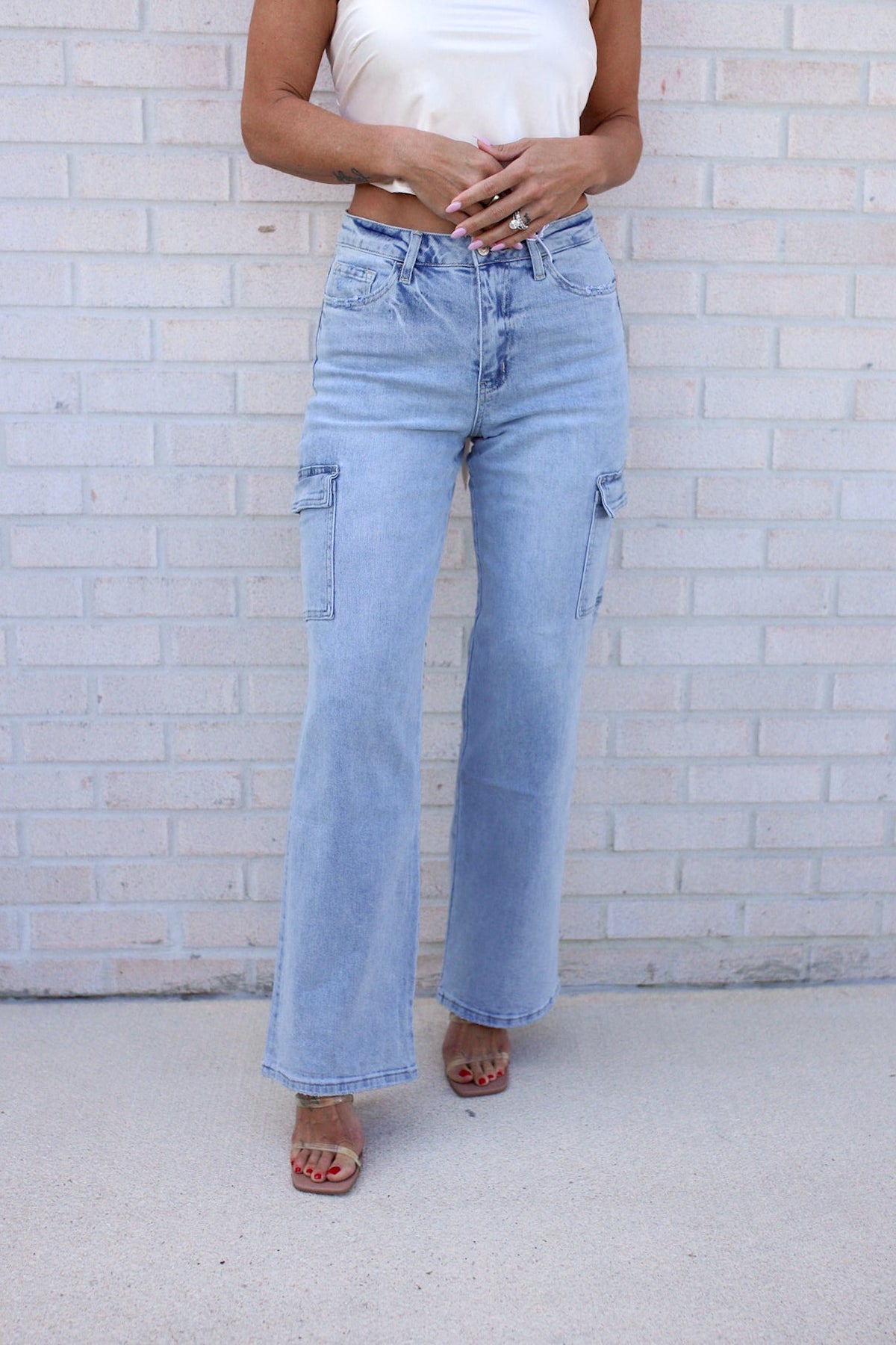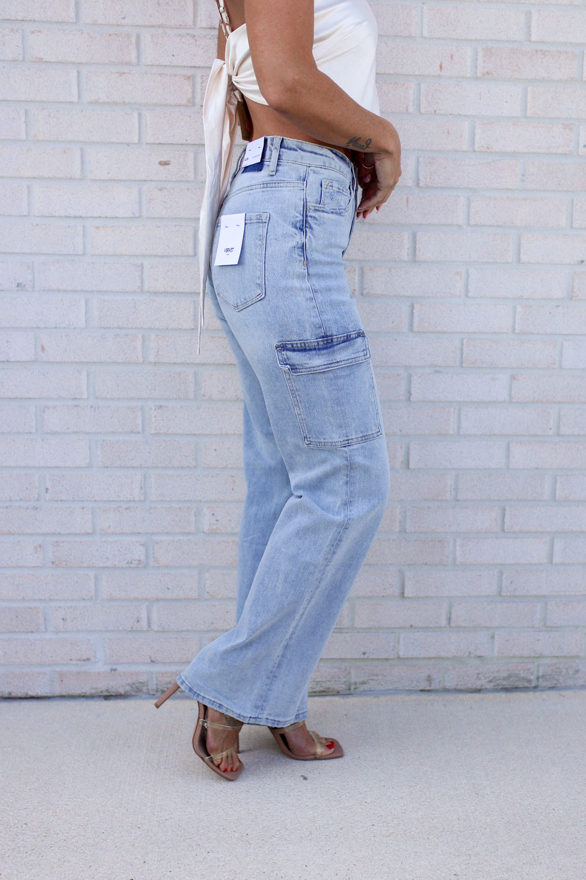 COMFORT STRETCH DENIM, SUPER HIGH RISE WAIST, 90'S VINTAGE STYLE, DISTRESSED DETAIL, FULL LENGTH, CARGO STRAIGHT JEANS