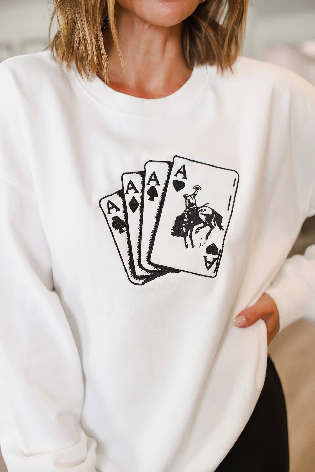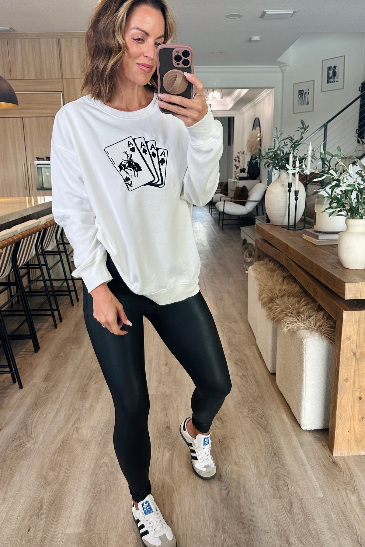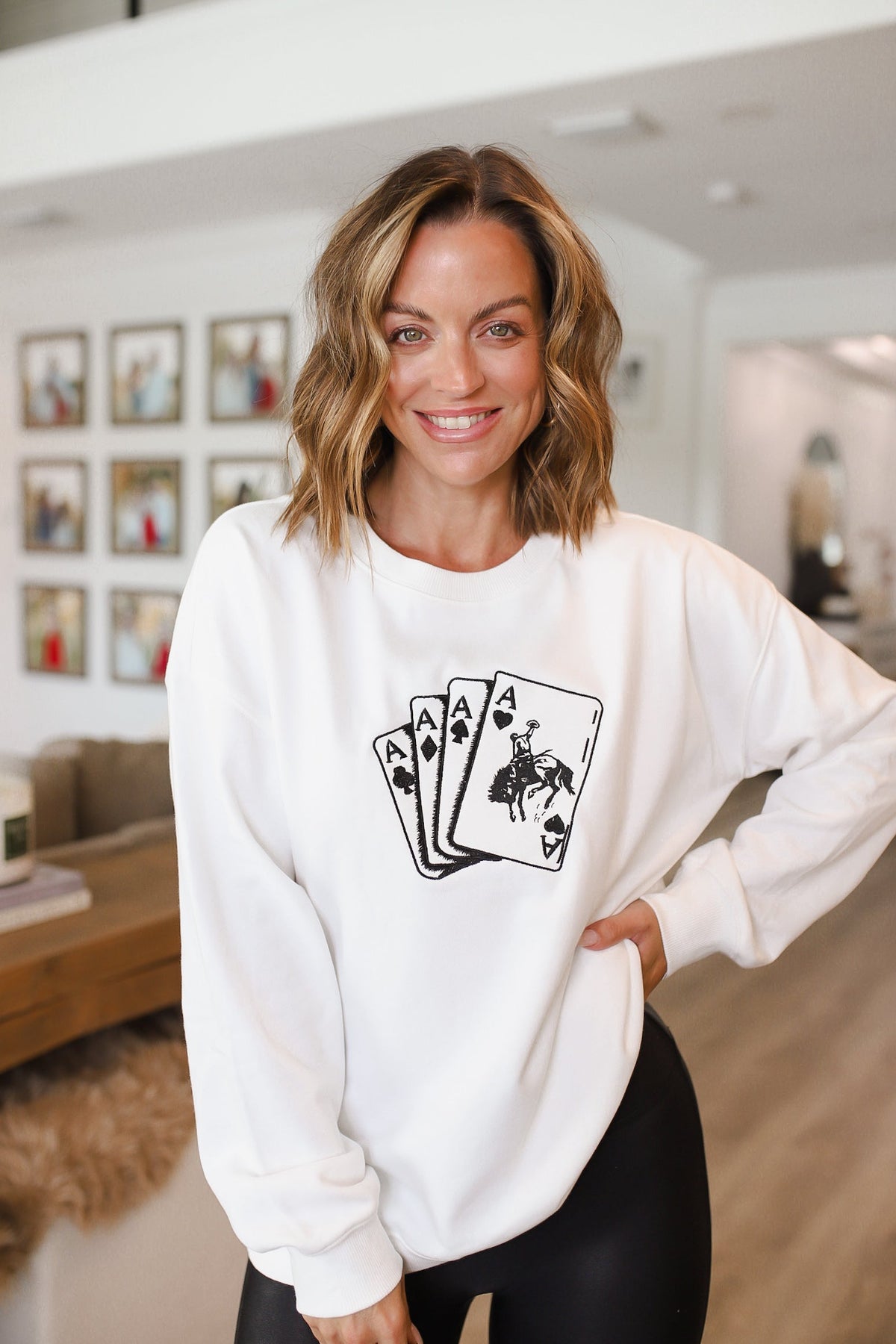 For the wild hearts and rebel souls, this graphic sweatshirt brings major Western energy. Featuring a bold ace card cowboy design, it’s the perfect mix of cool and comfy. The relaxed fit and soft fabric make it a go-to for everything from chilly nights to casual days. Pair with denim and boots for that effortlessly edgy vibe. The model sized up to the large for a relaxed fit.